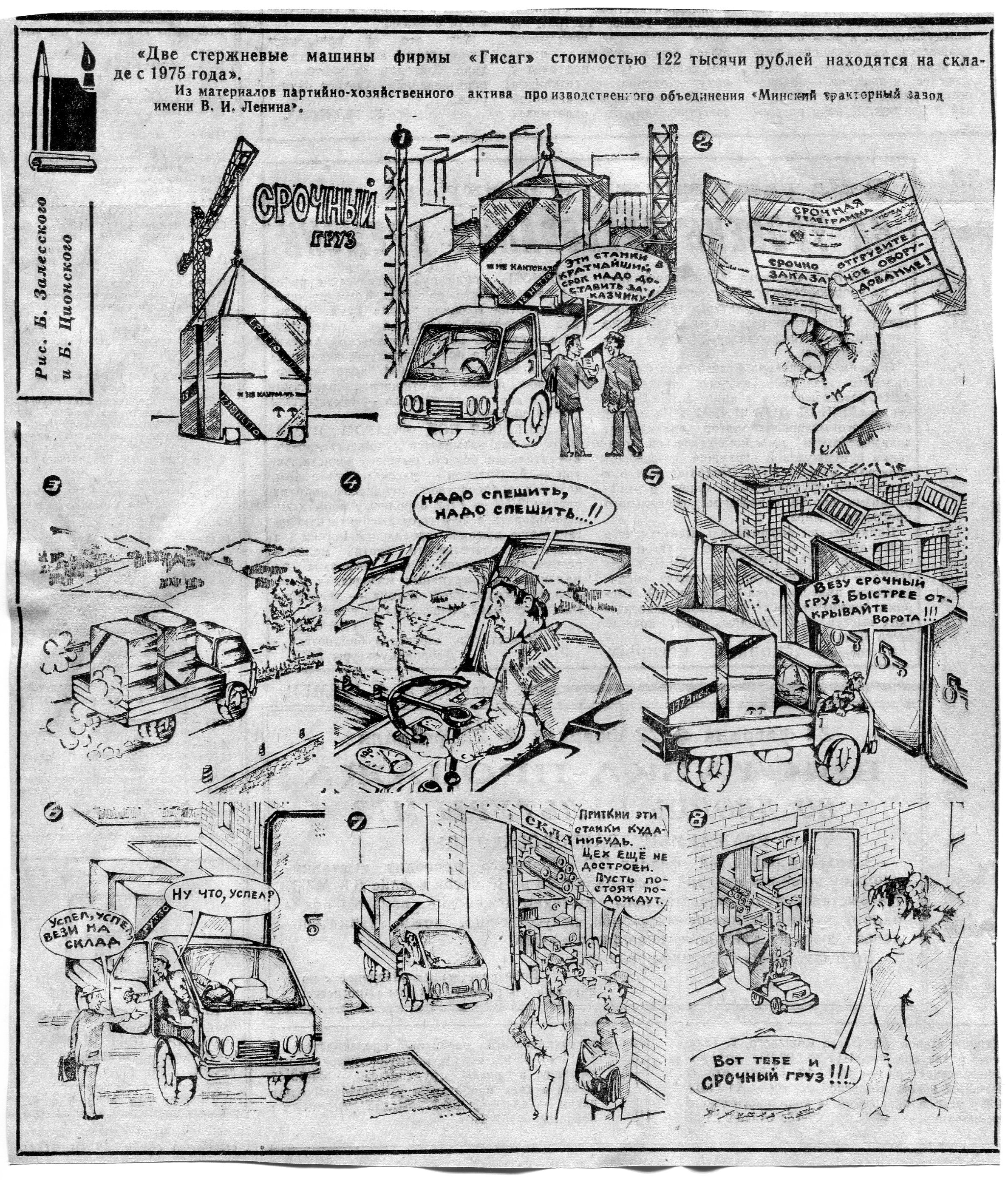 Залесский, Б. Срочный груз / Б. Залесский, Б. Ционский // Трактор. - 1986. - 16 февр.
