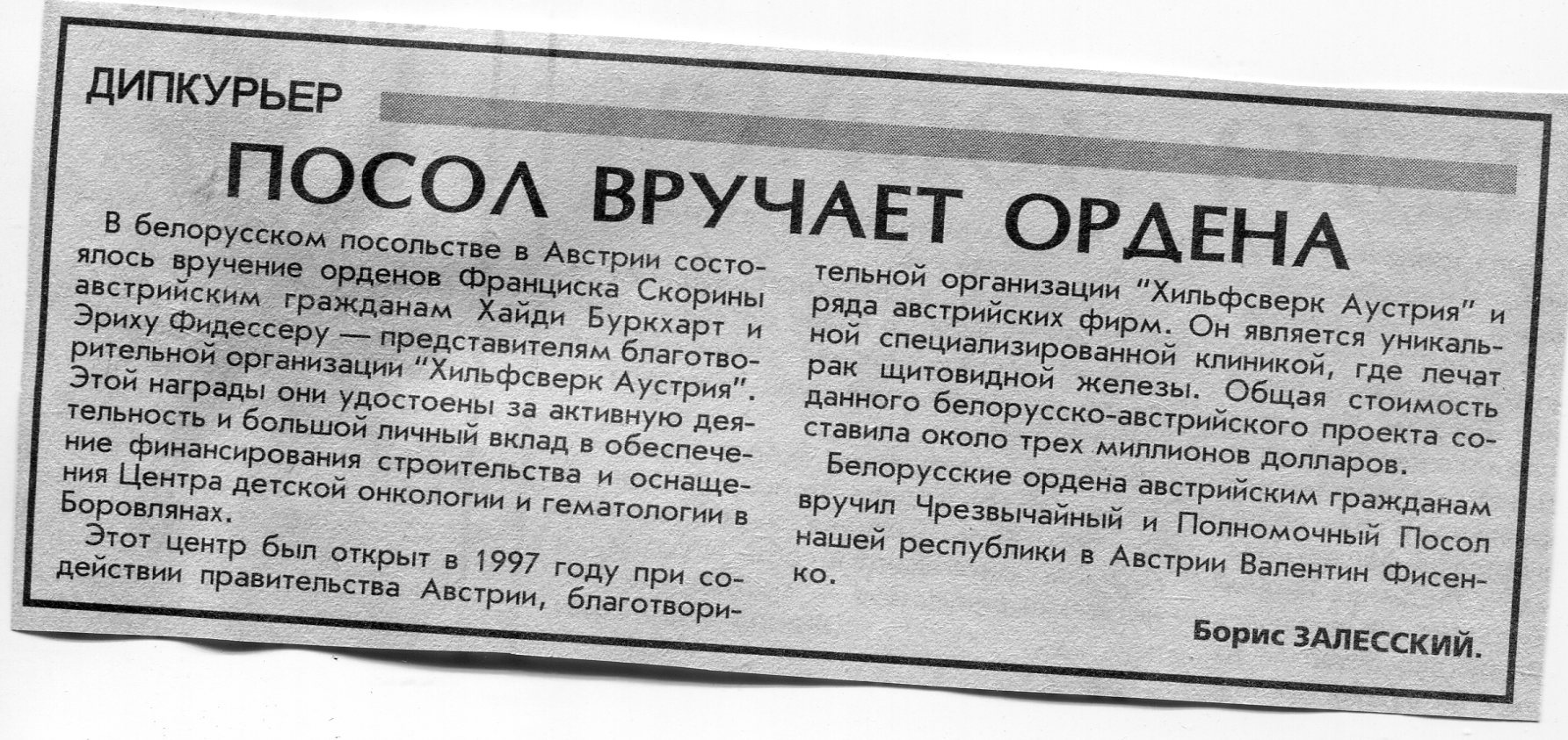 Залесский, Б. Посол вручает ордена / Б. Залесский // Вечерний Минск. - 1999. - 15 нояб.