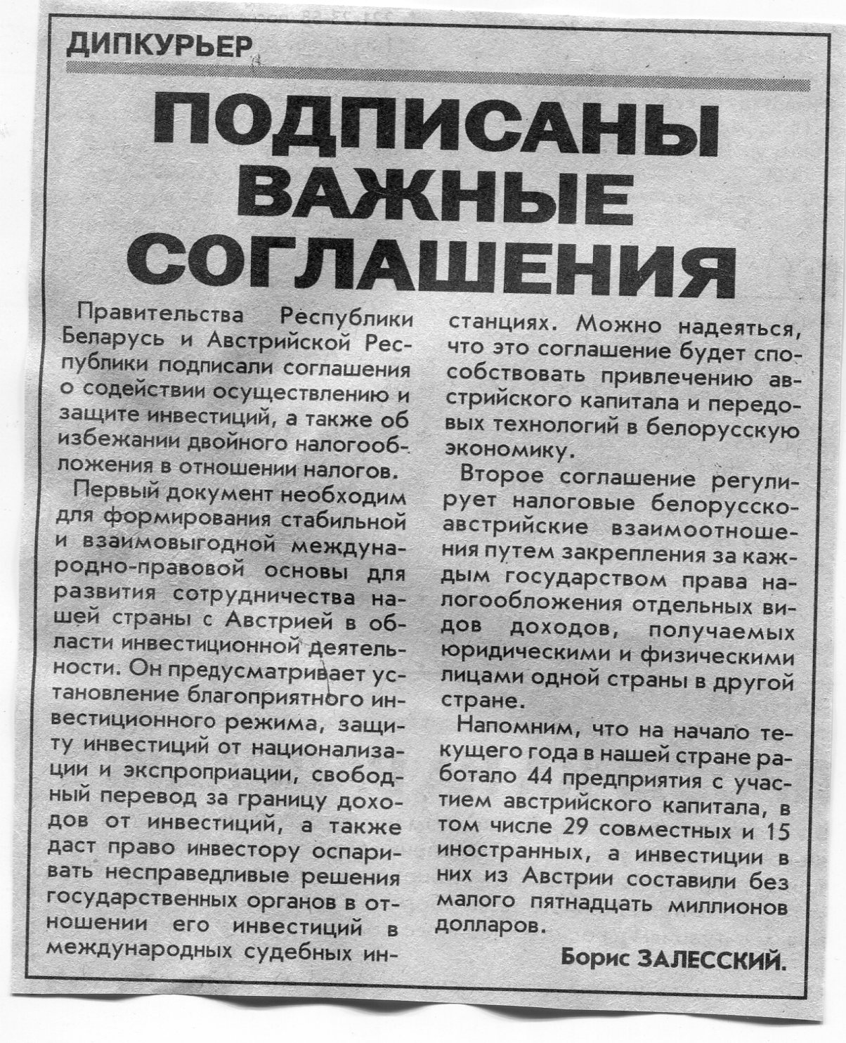 Залесский, Б. Соглашение парафировано / Б. Залесский // Вечерний Минск. - 1996. - 17 июн.