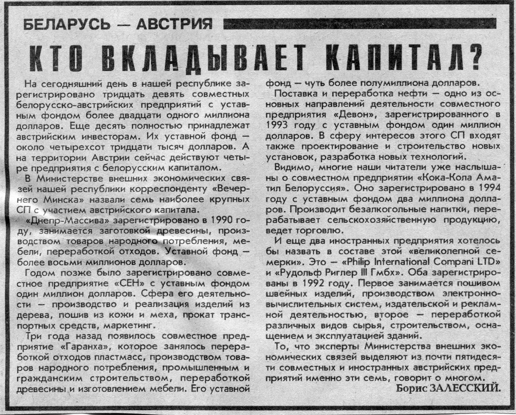 Залесский, Б. Кто вкладывает капитал? / Б. Залесский // Вечерний Минск. - 1995. - 23 окт.