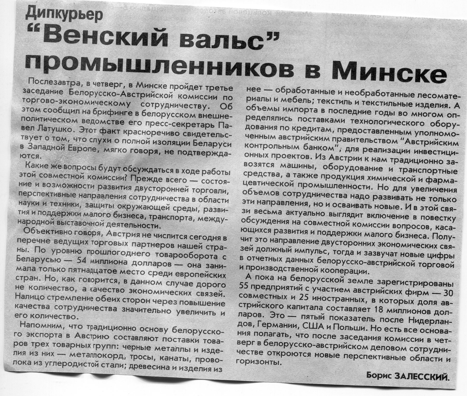 Залесский, Б. "Венский вальс" промышленников в Минске / Б. Залесский // Вечерний Минск. - 2002. - 16 июл.