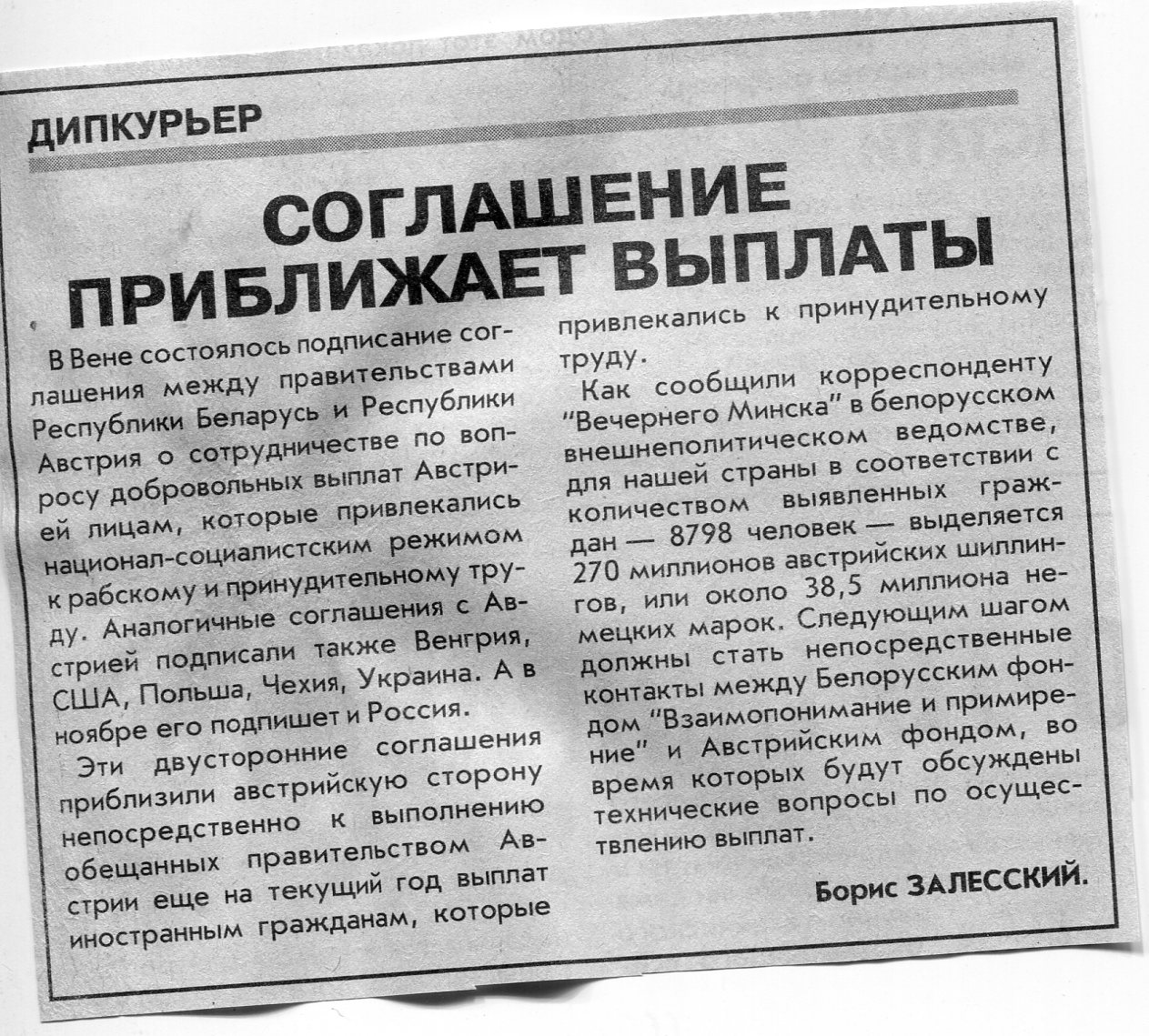 Залесский, Б. Соглашение приближает выплаты / Б. Залесский // Вечерний Минск. - 2000. - 1 нояб.