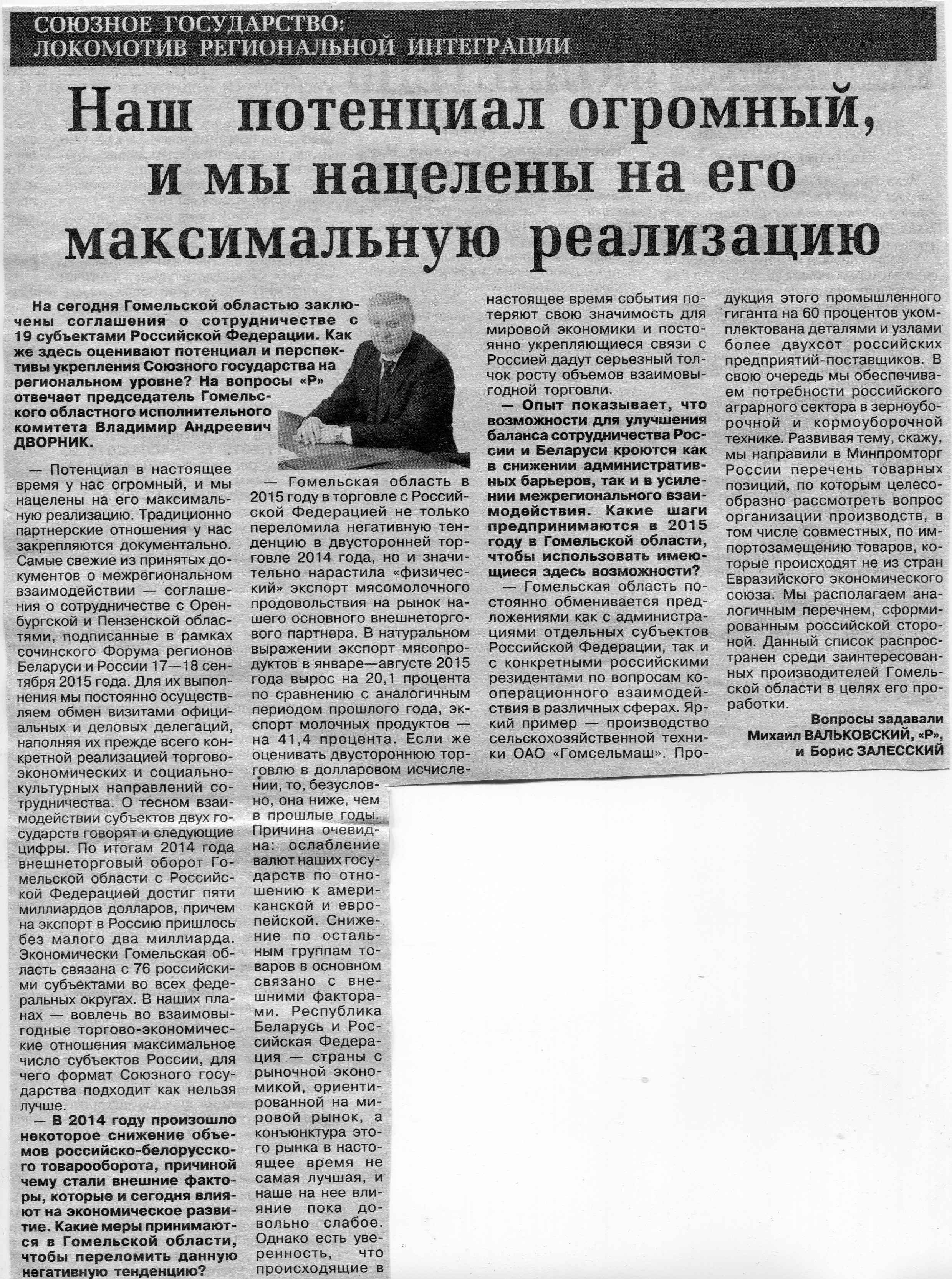 Залесский, Б. Наш потенциал огромный, и мы нацелены на его максимальную реализацию / Б. Залесский, М. Вальковский // Республика. - 2015.- 9 дек. - С. 3.