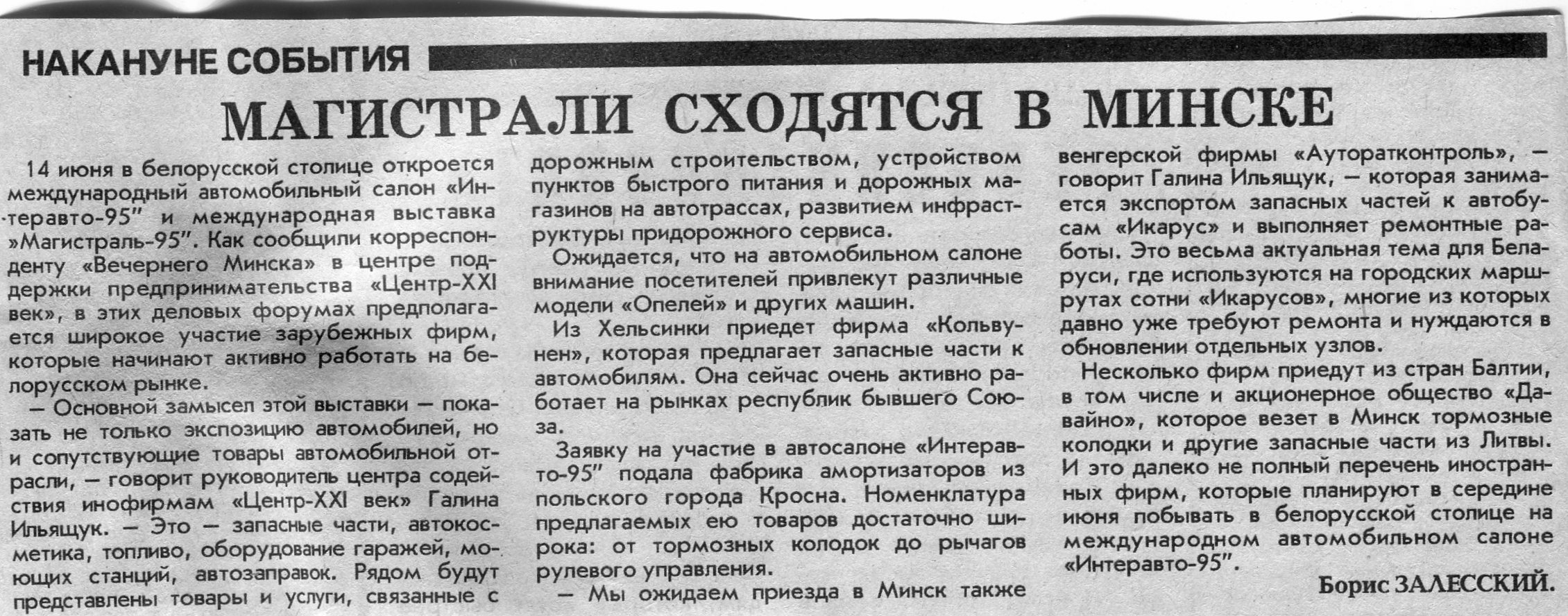 Залесский, Б. Магистрали сходятся в Минске / Б. Залесский // Вечерний Минск. – 1995. – 6 июн.