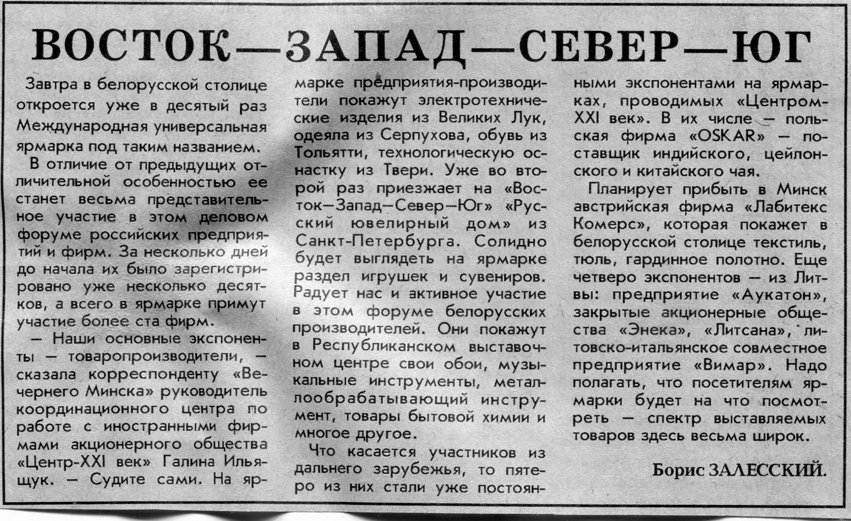 Залесский, Б. Восток - Запад - Север - Юг / Б. Залесский // Вечерний Минск. – 1995. – 4 июл.