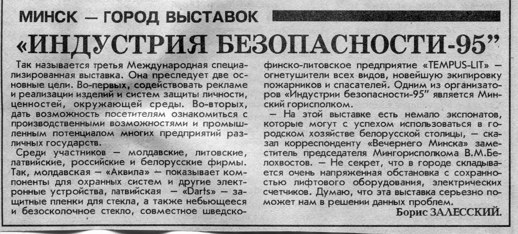 Залесский, Б. "Индустрия безопасности-95" / Б. Залесский // Вечерний Минск. – 1995. – 23 июн.