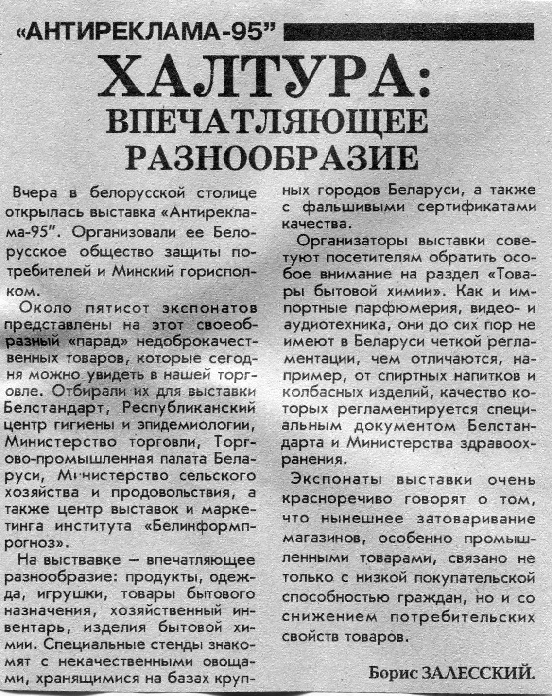 Залесский, Б. Халтура: впечатляющее разнообразие / Б. Залесский // Вечерний Минск. – 1995. – 24 мая.