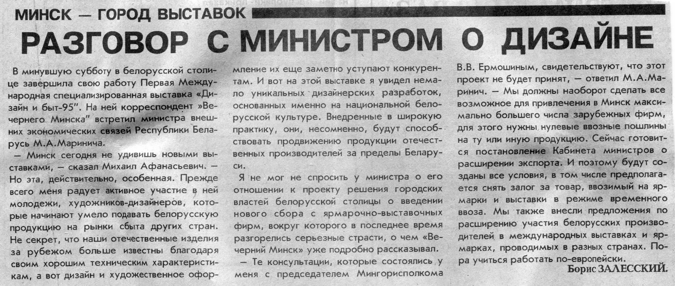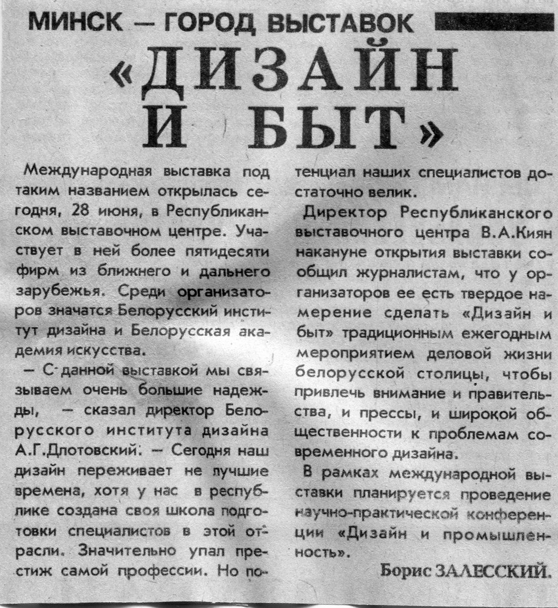 Залесский, Б. "Дизайн и быт" / Б. Залесский // Вечерний Минск. – 1995. – 28 июн.