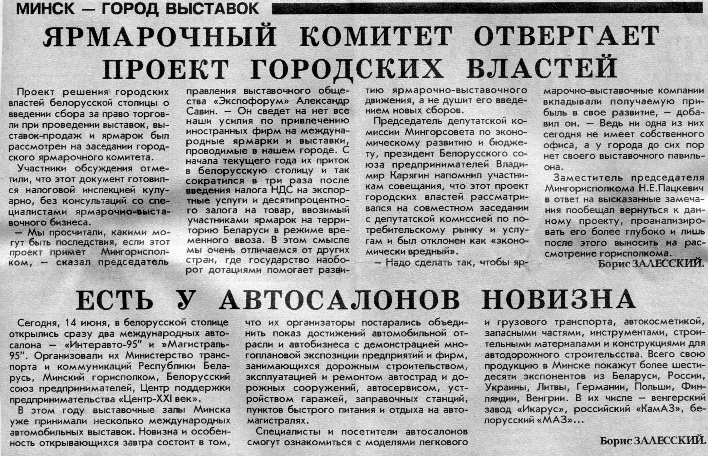 Залесский, Б. Ярмарочный комитет отвергает проект городских властей / Б. Залесский // Вечерний Минск. – 1995. – 14 июн.