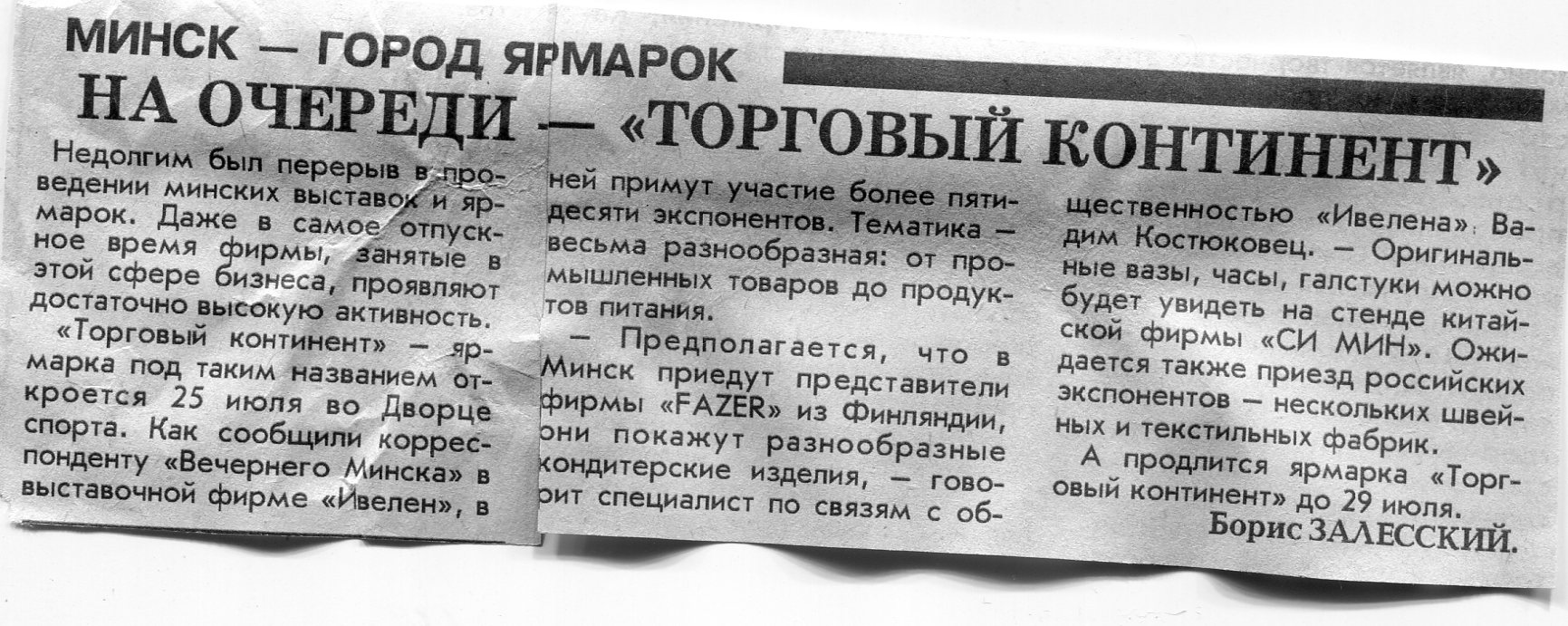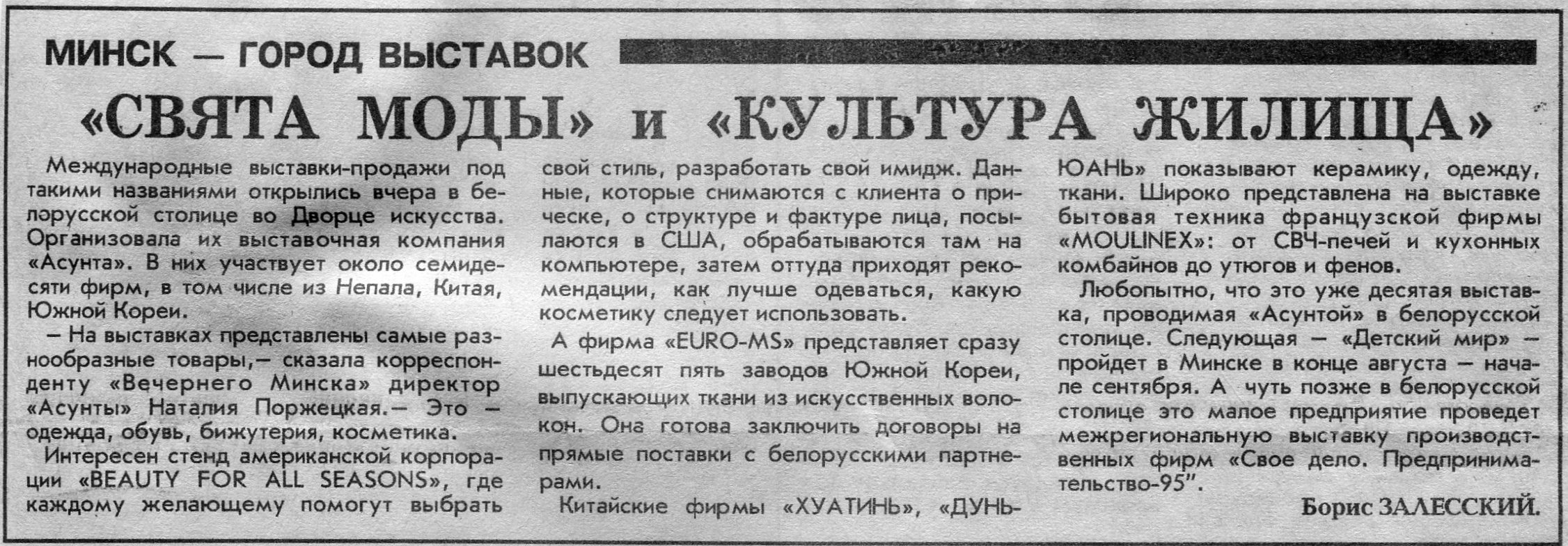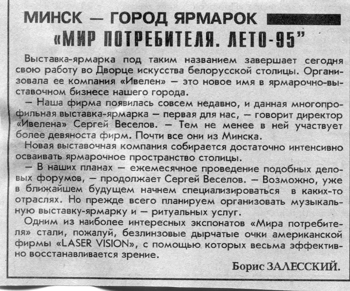 Залесский, Б. "Мир потребителя. Лето-95" / Б. Залесский // Вечерний Минск. – 1995. – 9 июн.