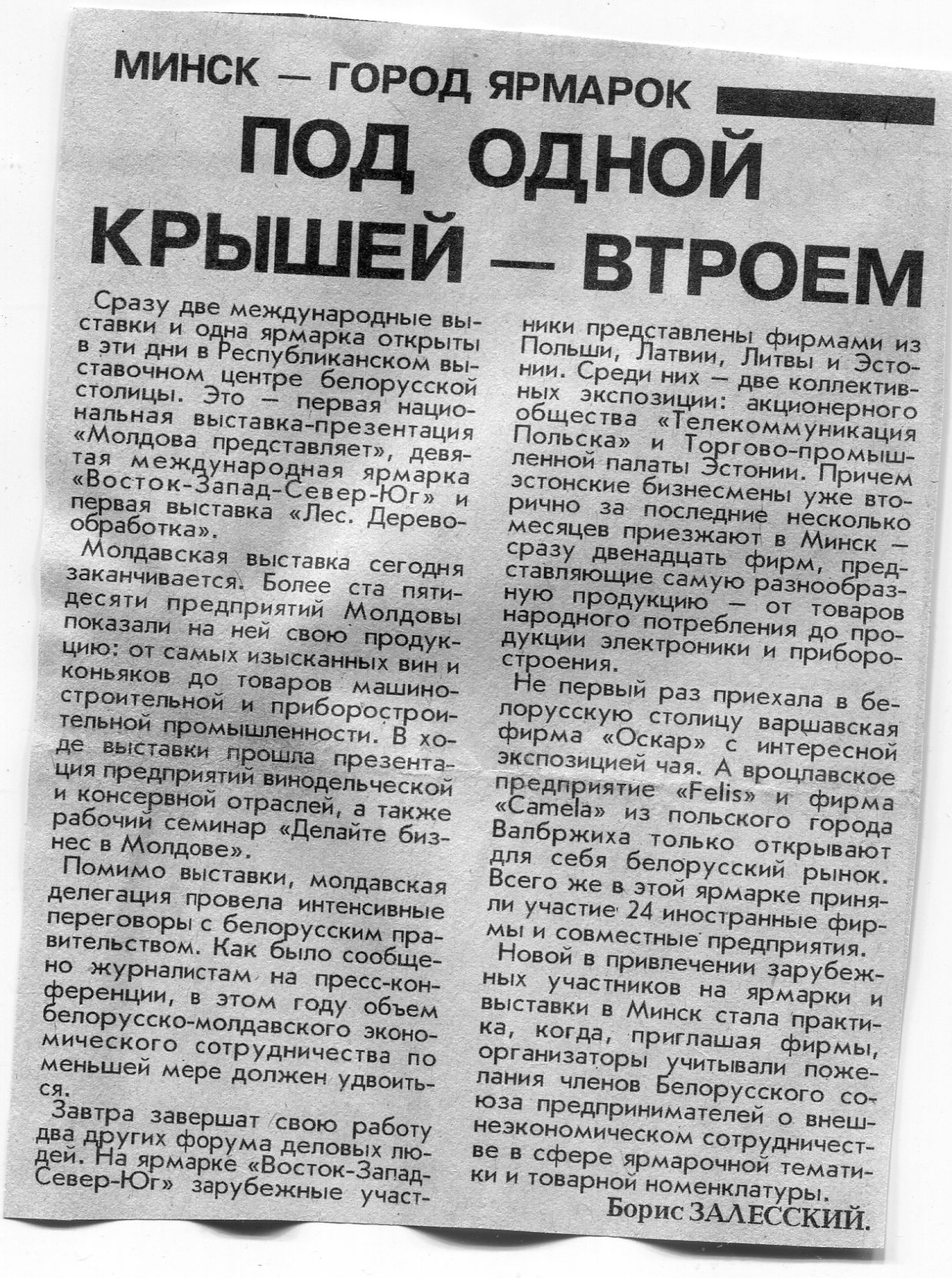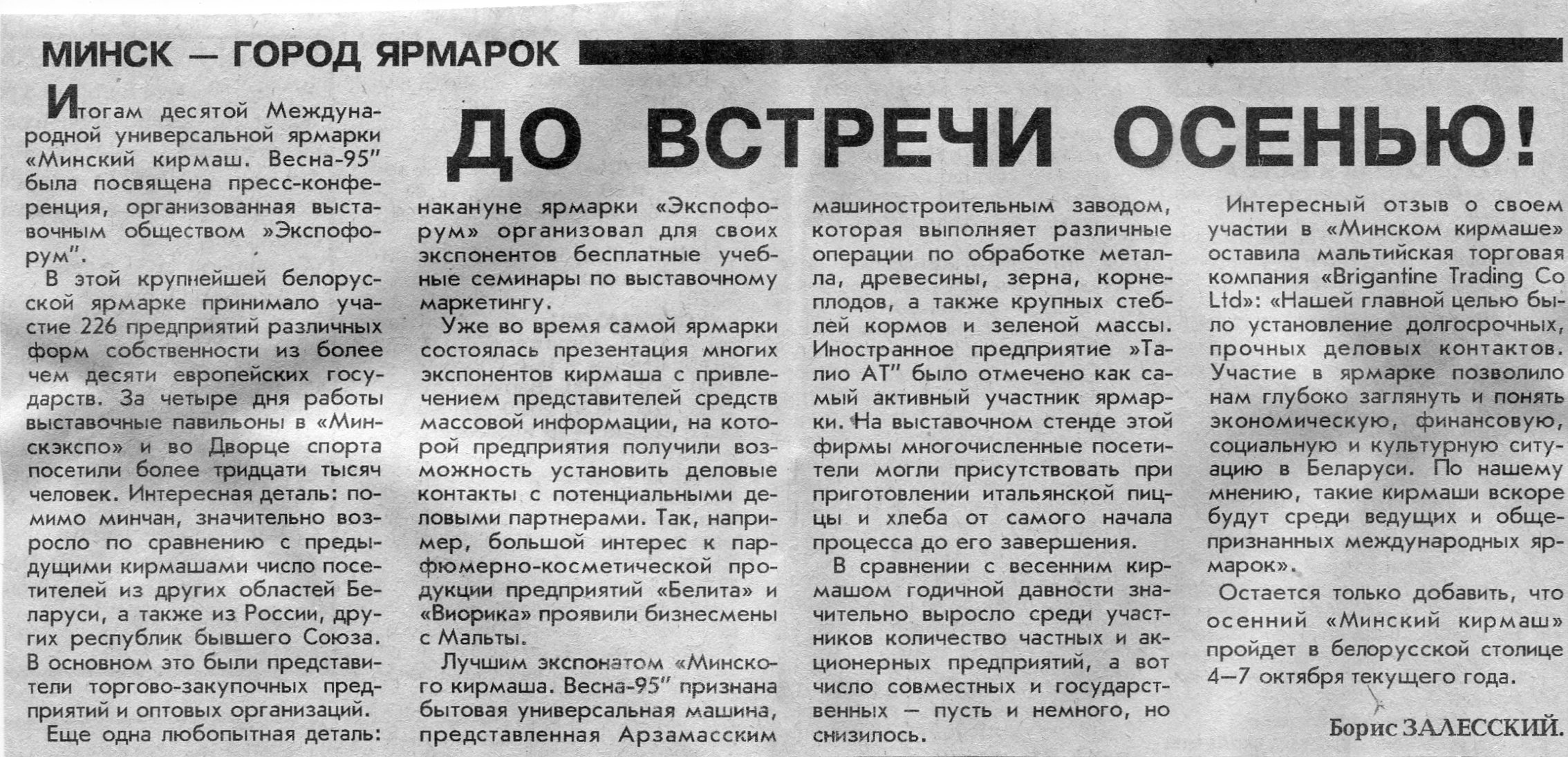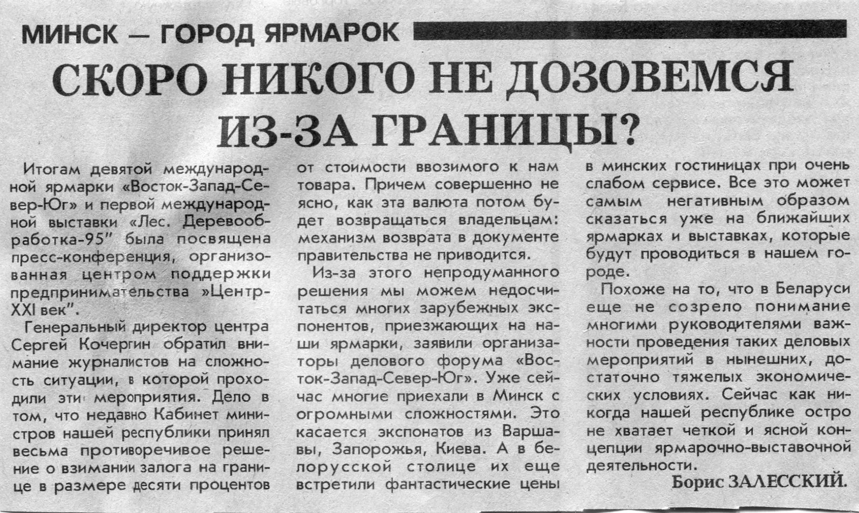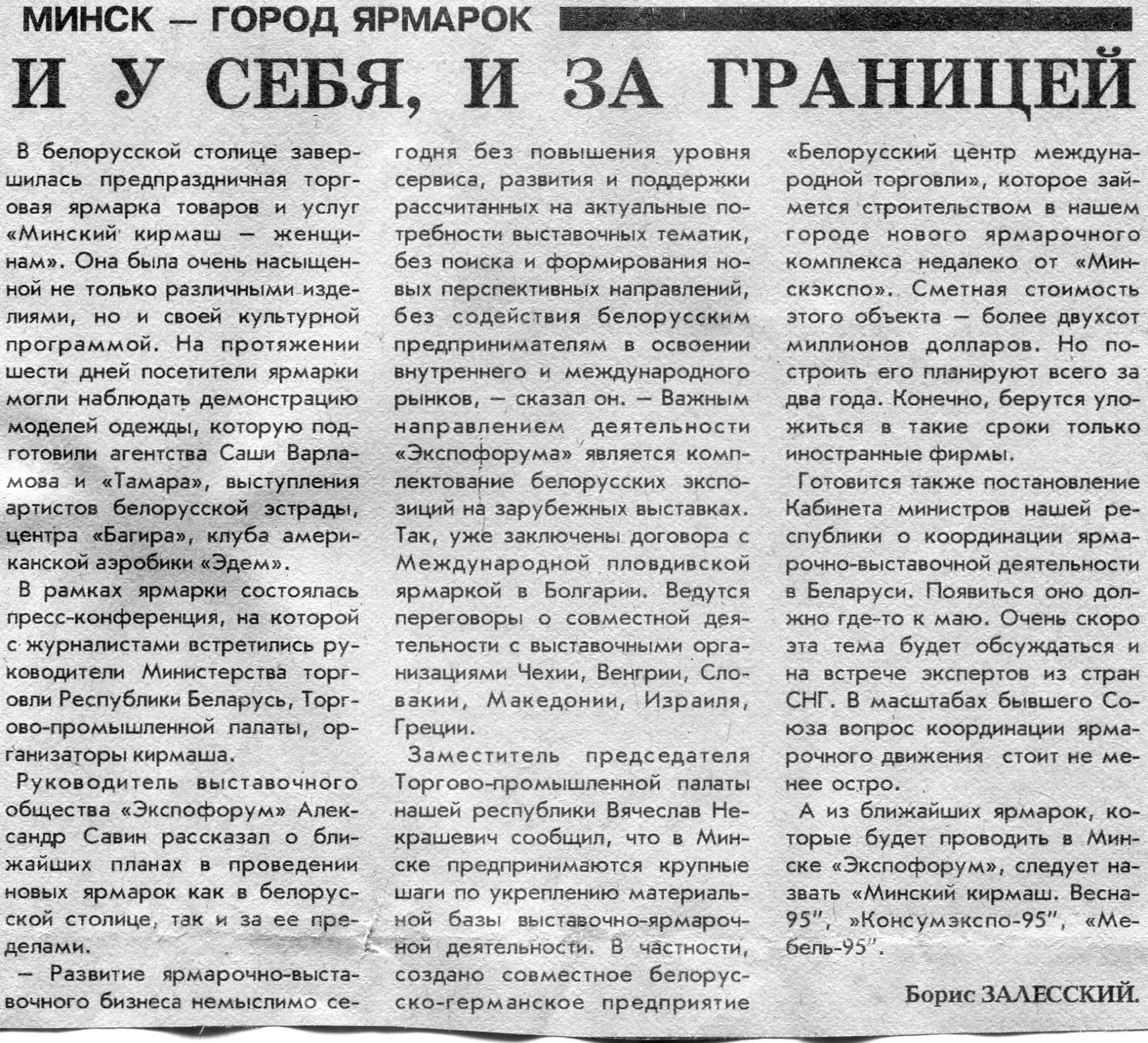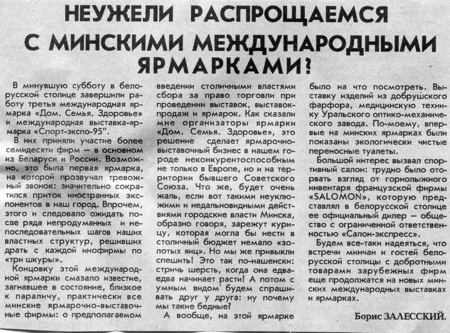 Залесский, Б. Неужели распрощаемся с минскими международными ярмарками? / Б. Залесский // Вечерний Минск. – 1995. – 23 мая.