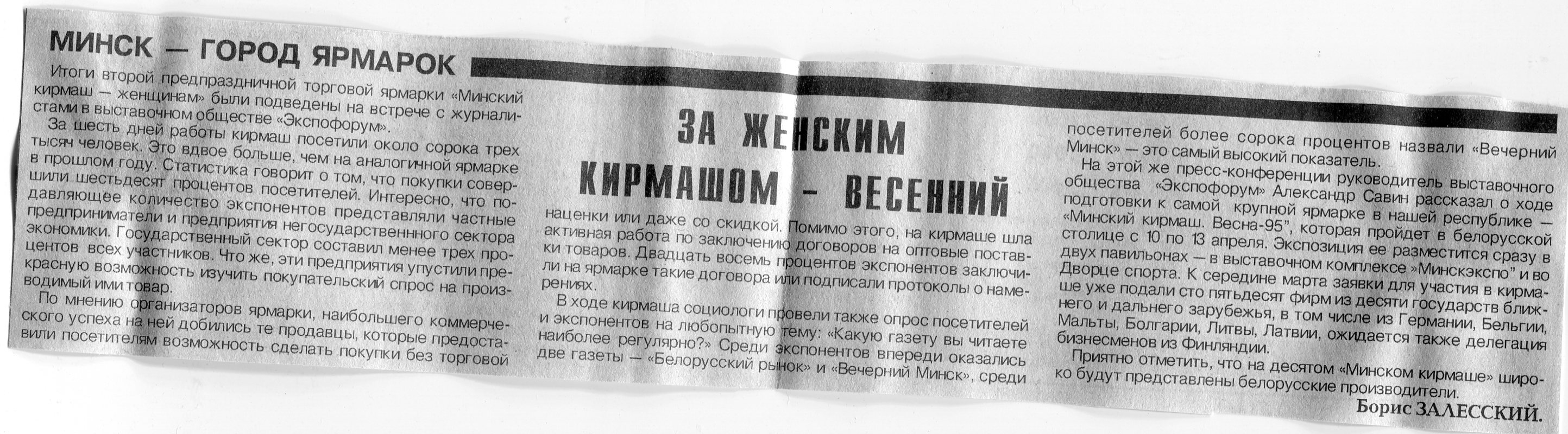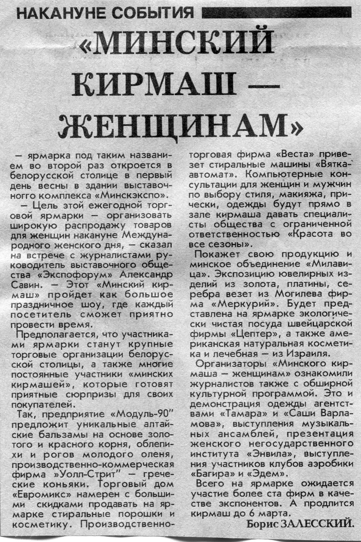 Залесский, Б. "Минский кирмаш - женщинам" / Б. Залесский // Вечерний Минск. – 1995. – 21 февр.
