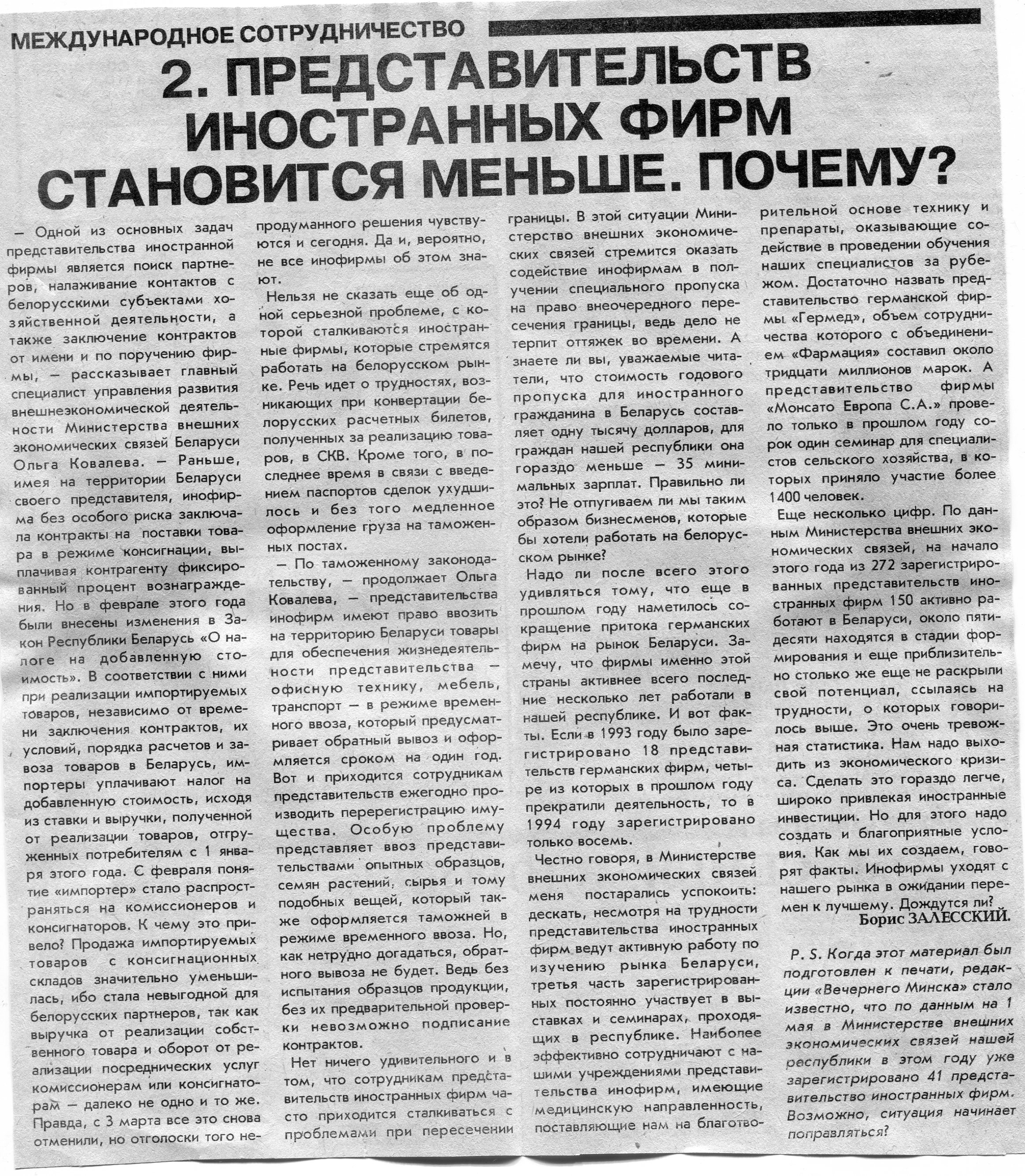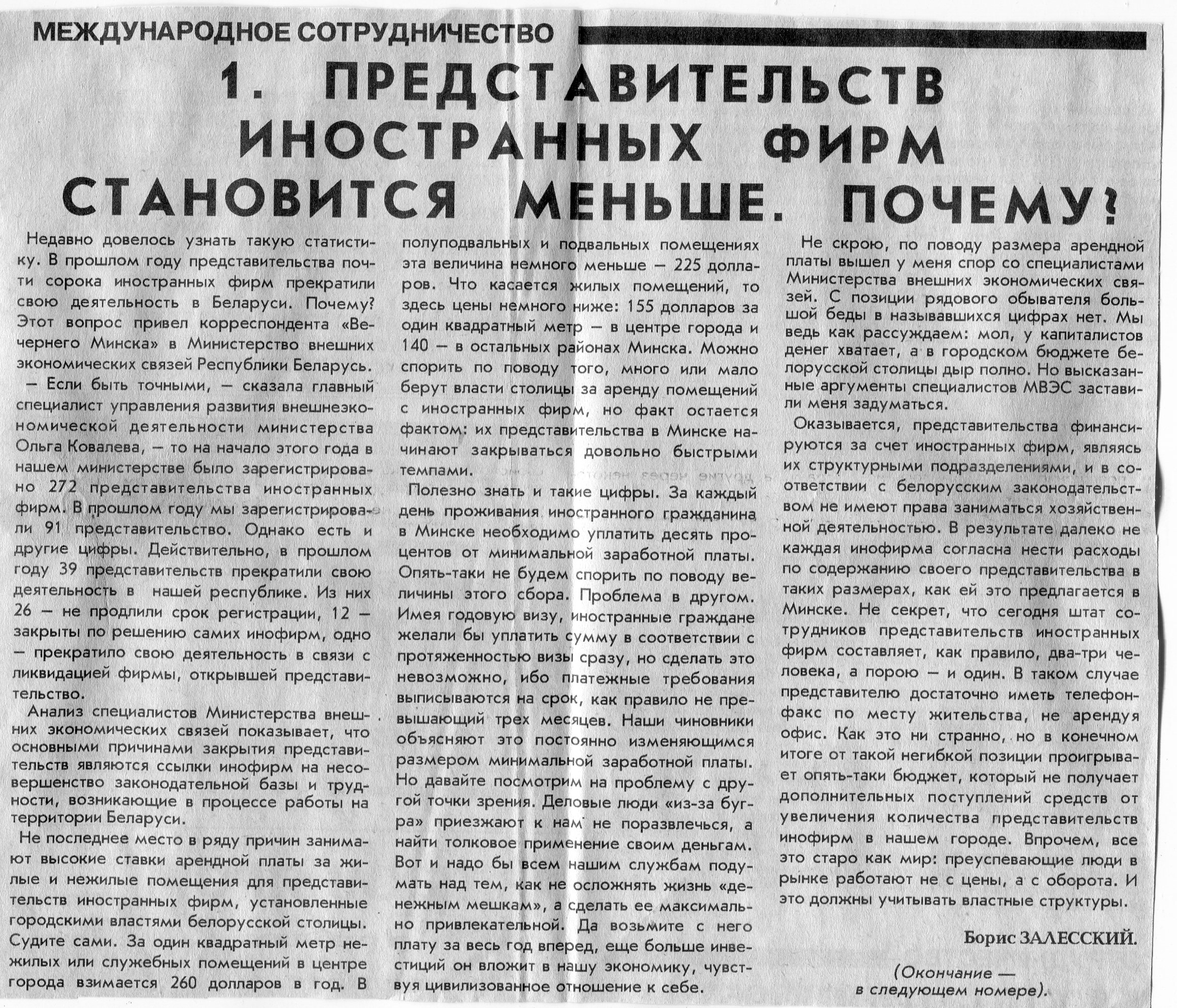 Залесский, Б. 2.Представительств иностранных фирм становится меньше. Почему? / Б. Залесский // Вечерний Минск. - 1995. - 16 мая.