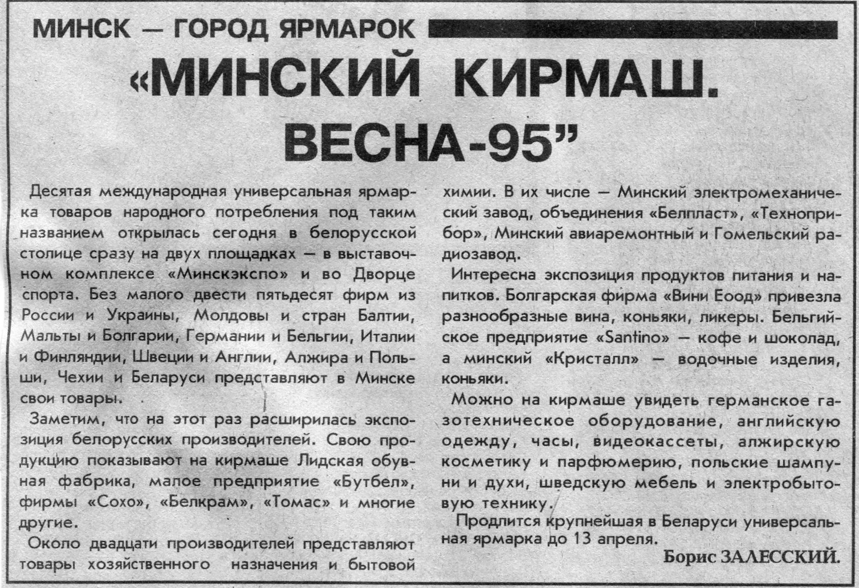 Залесский, Б. "Минский кирмаш. Весна-95" / Б. Залесский // Вечерний Минск. – 1995. – 10 апр.