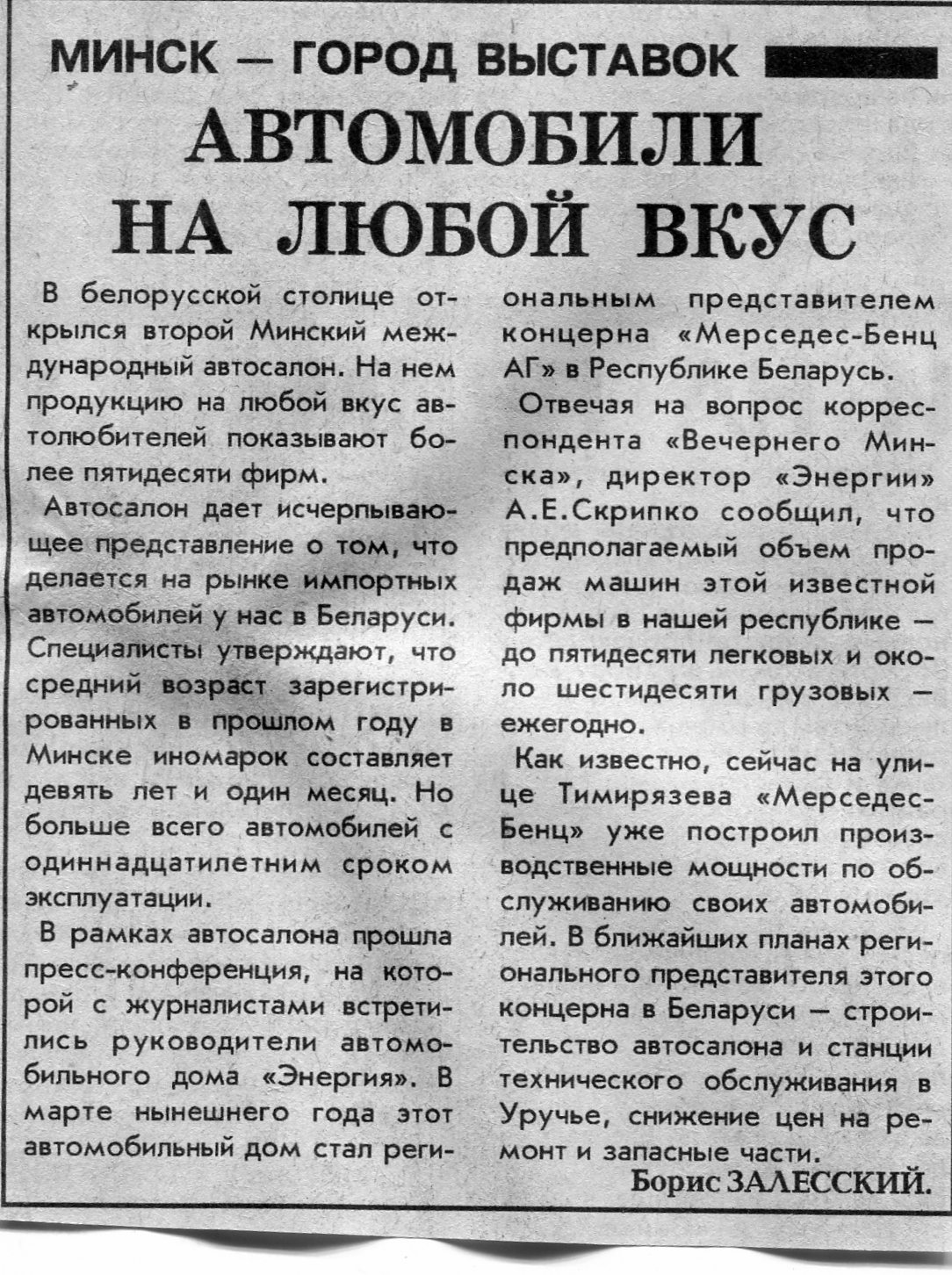 Залесский, Б. Автомобили на любой вкус / Б. Залесский // Вечерний Минск. – 1995. – 5 мая.