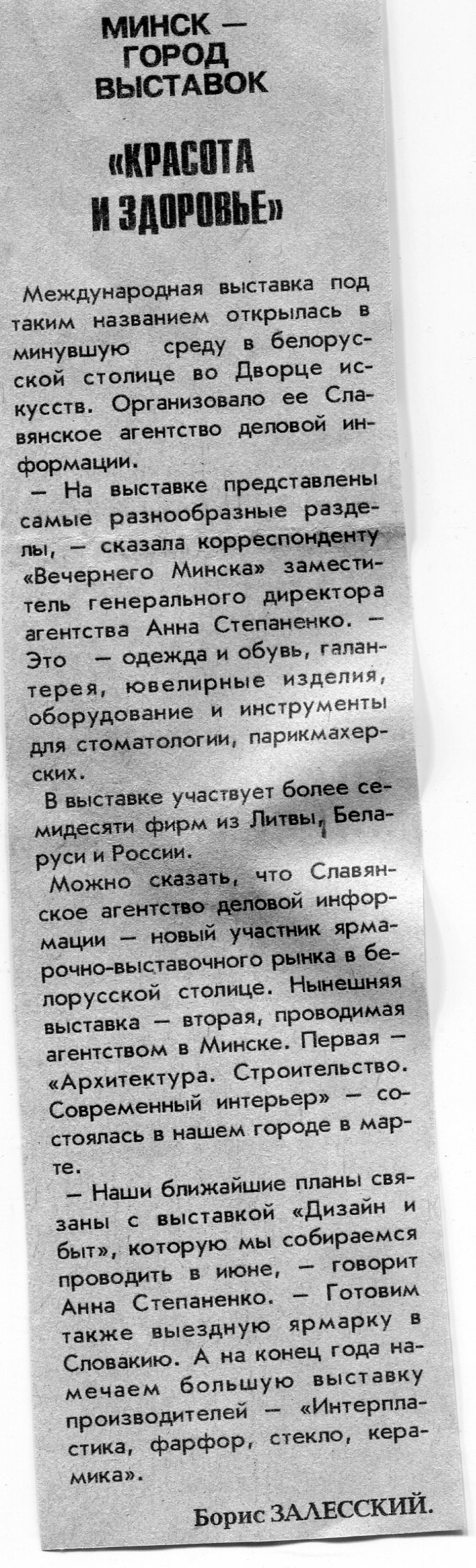 Залесский, Б. "Красота и здоровье" / Б. Залесский // Вечерний Минск. – 1995. – 28 апр.