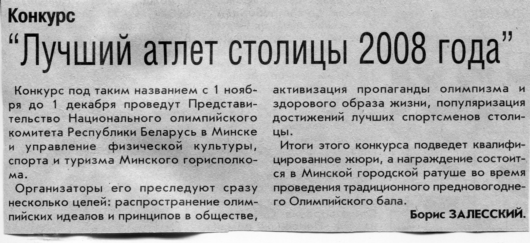 Залесский, Б. "Лучший атлет столицы 2008 года" / Б. Залесский // Вечерний Минск. – 2008. – 31 окт.