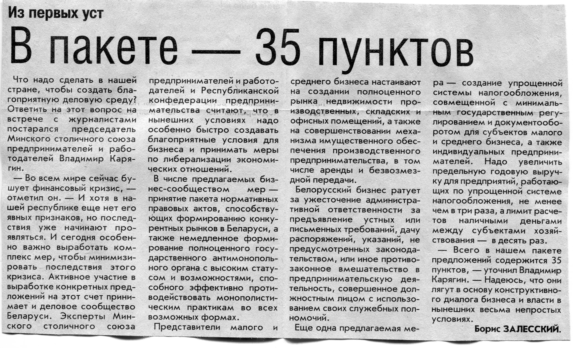 Залесский, Б. В пакете - 35 пунктов / Б. Залесский // Вечерний Минск. – 2008. – 19 нояб.