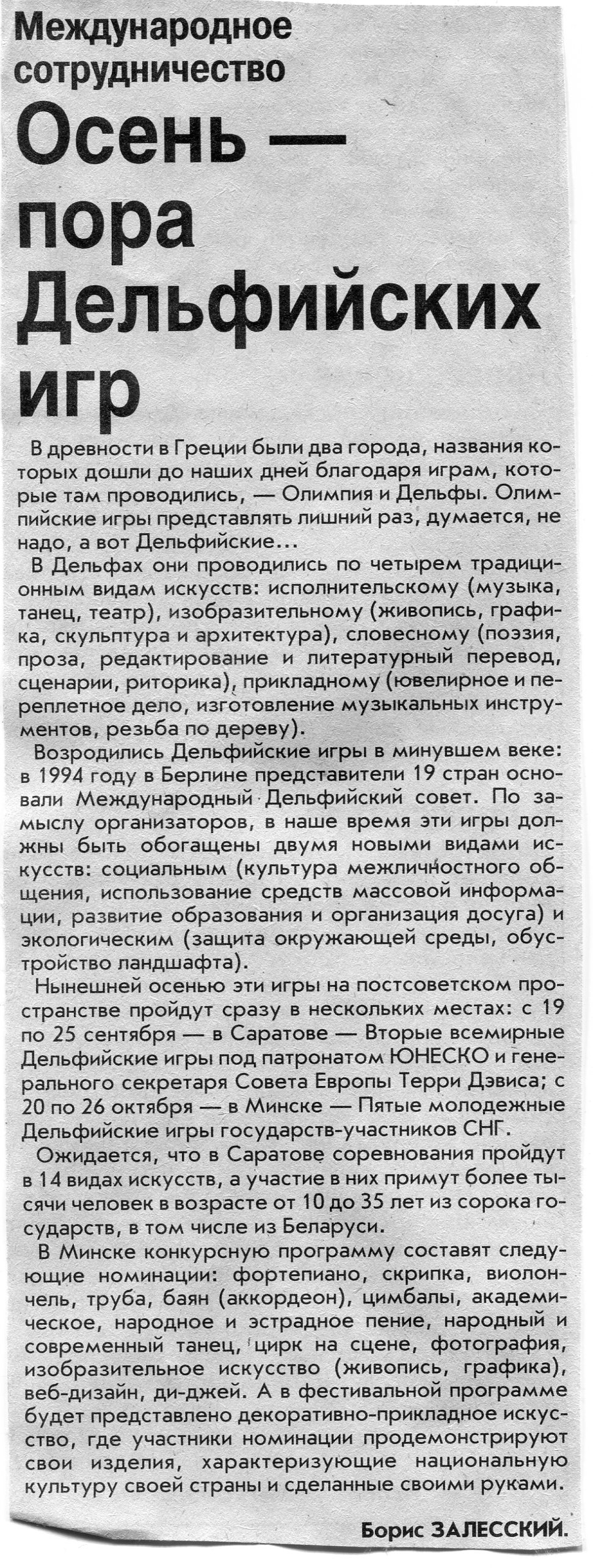 Залесский, Б. Осень - пора Дельфийских игр / Б. Залесский // Вечерний Минск. – 2008. – 4 сент.