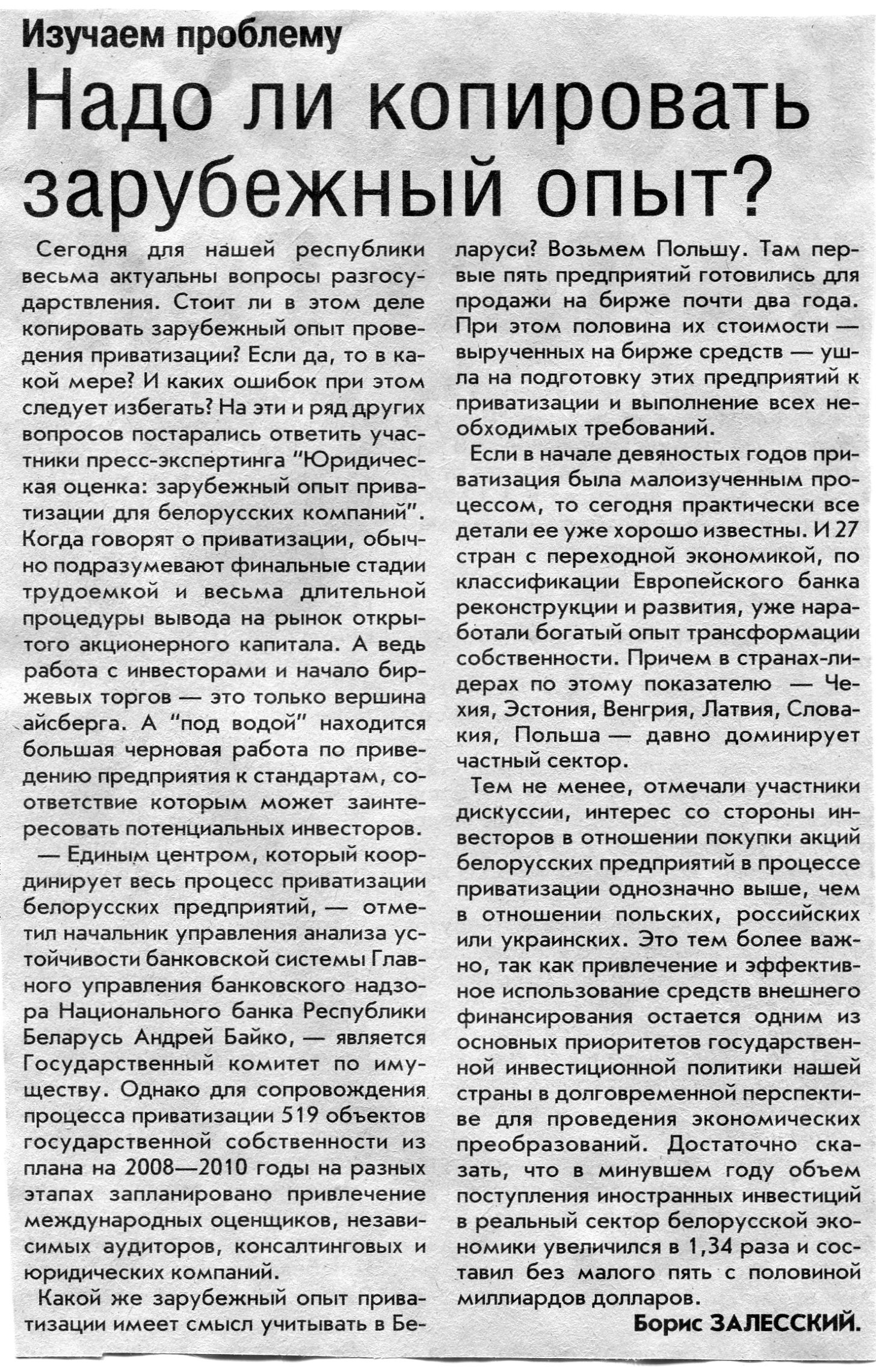 Залесский, Б. Надо ли копировать зарубежный опыт? / Б. Залесский // Вечерний Минск. – 2008. – 1 дек.