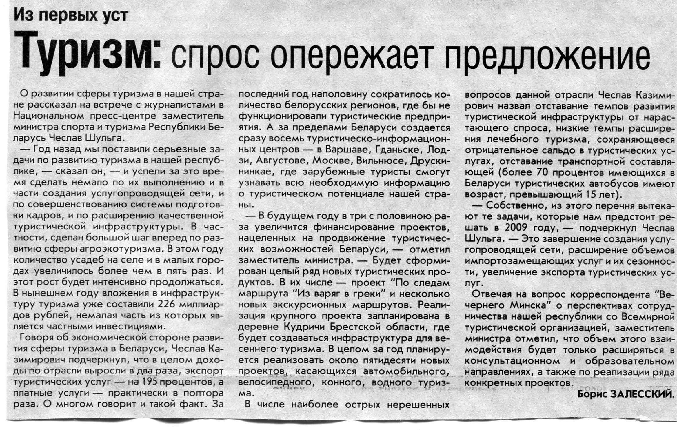 Залесский, Б. Туризм: спрос опережает предложение / Б. Залесский // Вечерний Минск. – 2008. – 29 сент.