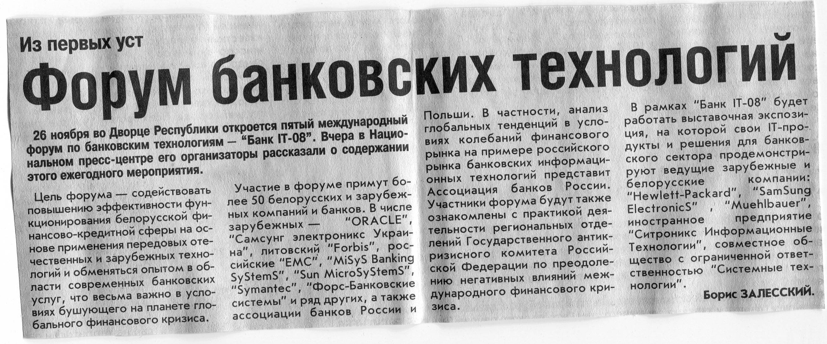 Залесский, Б. Форум банковских технологий / Б. Залесский // Вечерний Минск. – 2008. – 20 нояб.