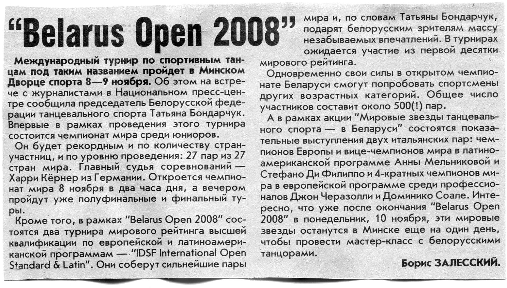Залесский, Б. "Belarus Open 2008" / Б. Залесский // Вечерний Минск. – 2008. – 4 нояб.