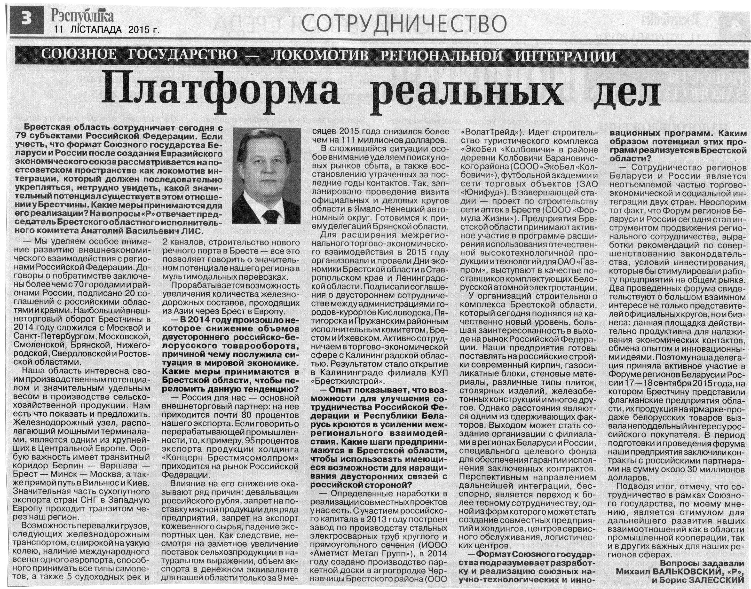 Залесский, Б. Платформа реальных дел / Б. Залесский, М. Вальковский // Республика. - 2015.- 11 нояб. - С. 3.