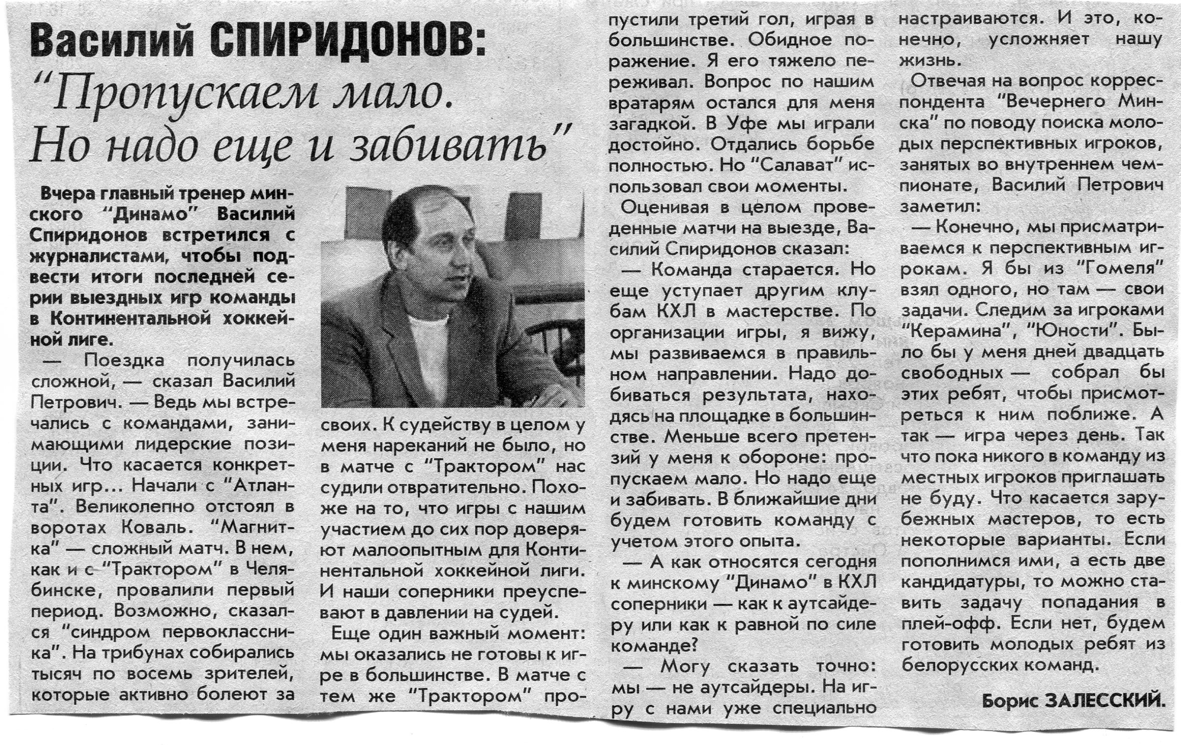 Залесский, Б. Василий Спиридонов: "Пропускаем мало. Но надо еще и забивать" / Б. Залесский // Вечерний Минск. – 2008. – 21 нояб.