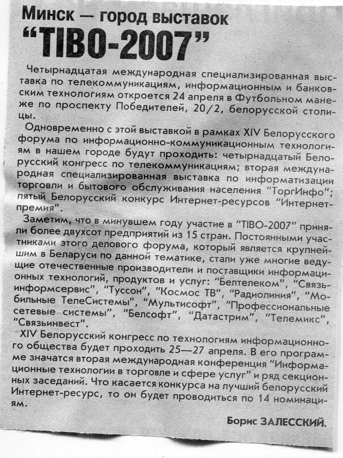 Залесский, Б. "TIBO-2007" / Б. Залесский // Вечерний Минск. – 2007. – 20 апр.