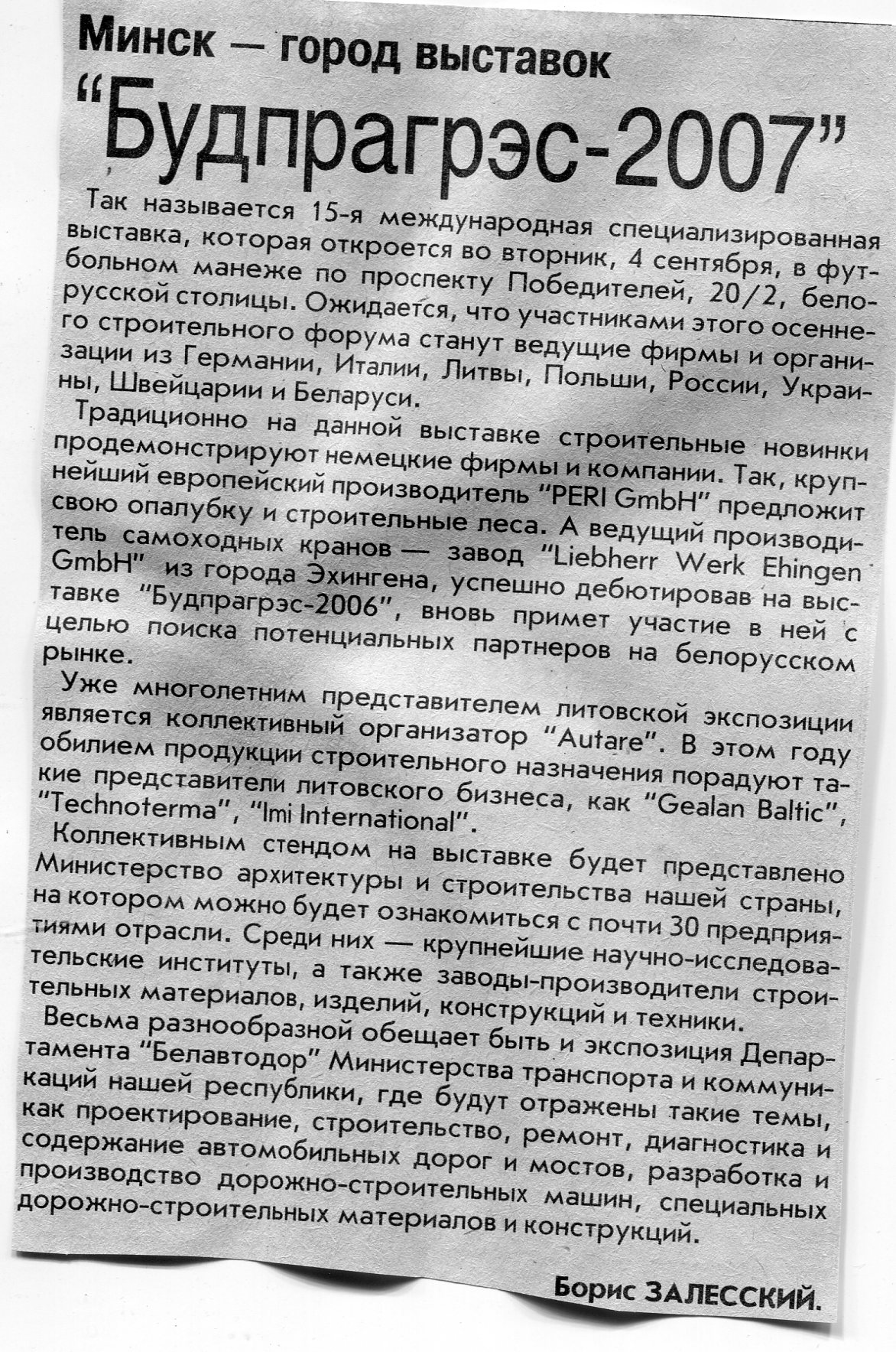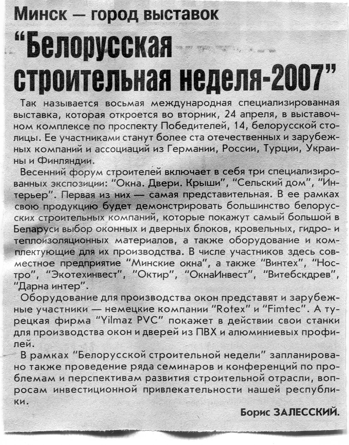 Залесский, Б. "Белорусская строительная неделя-2007" / Б. Залесский // Вечерний Минск. – 2007. – 20 апр.