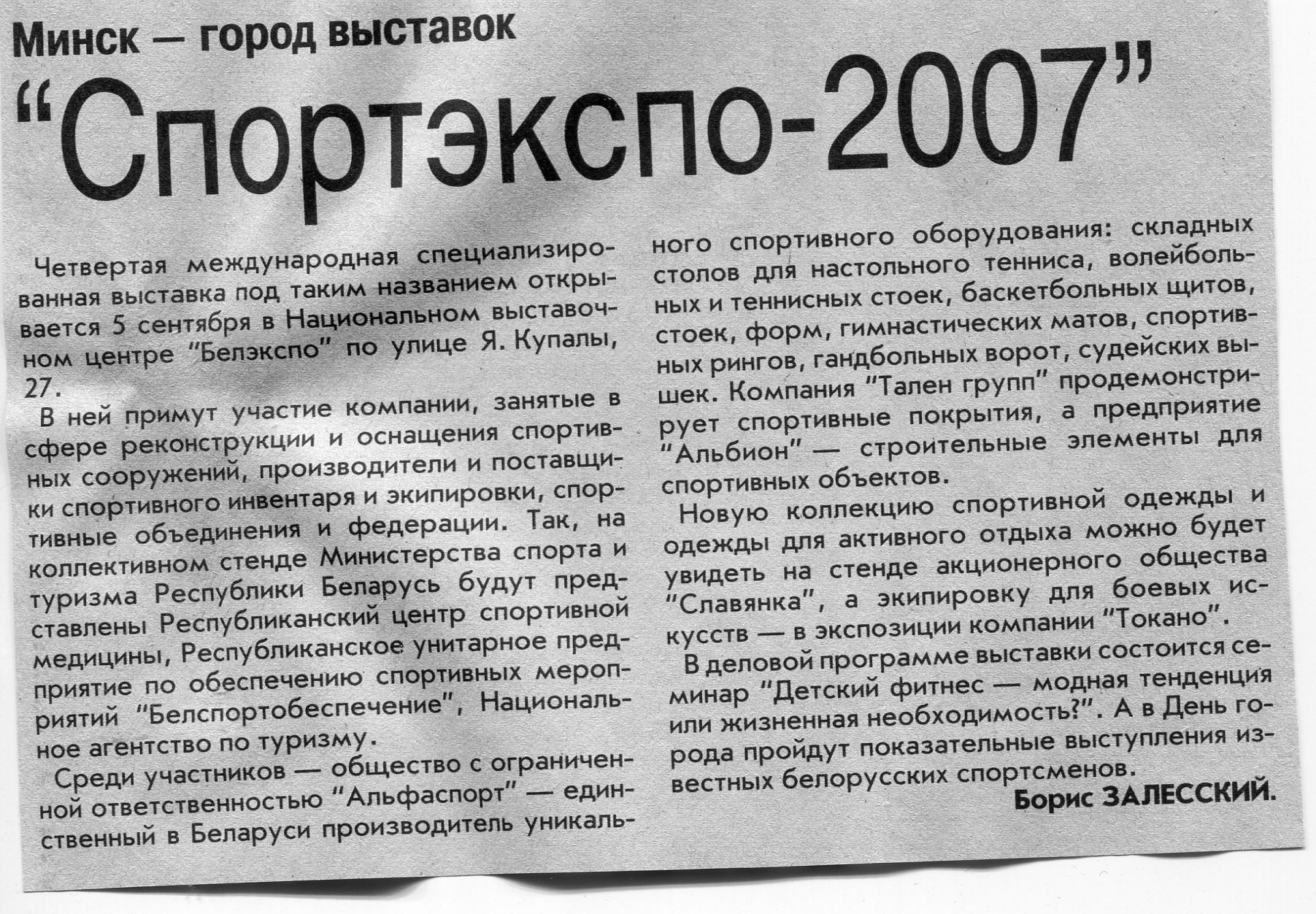 Залесский, Б. "Спортэкспо-2007" / Б. Залесский // Вечерний Минск. – 2007. – 5 сент.