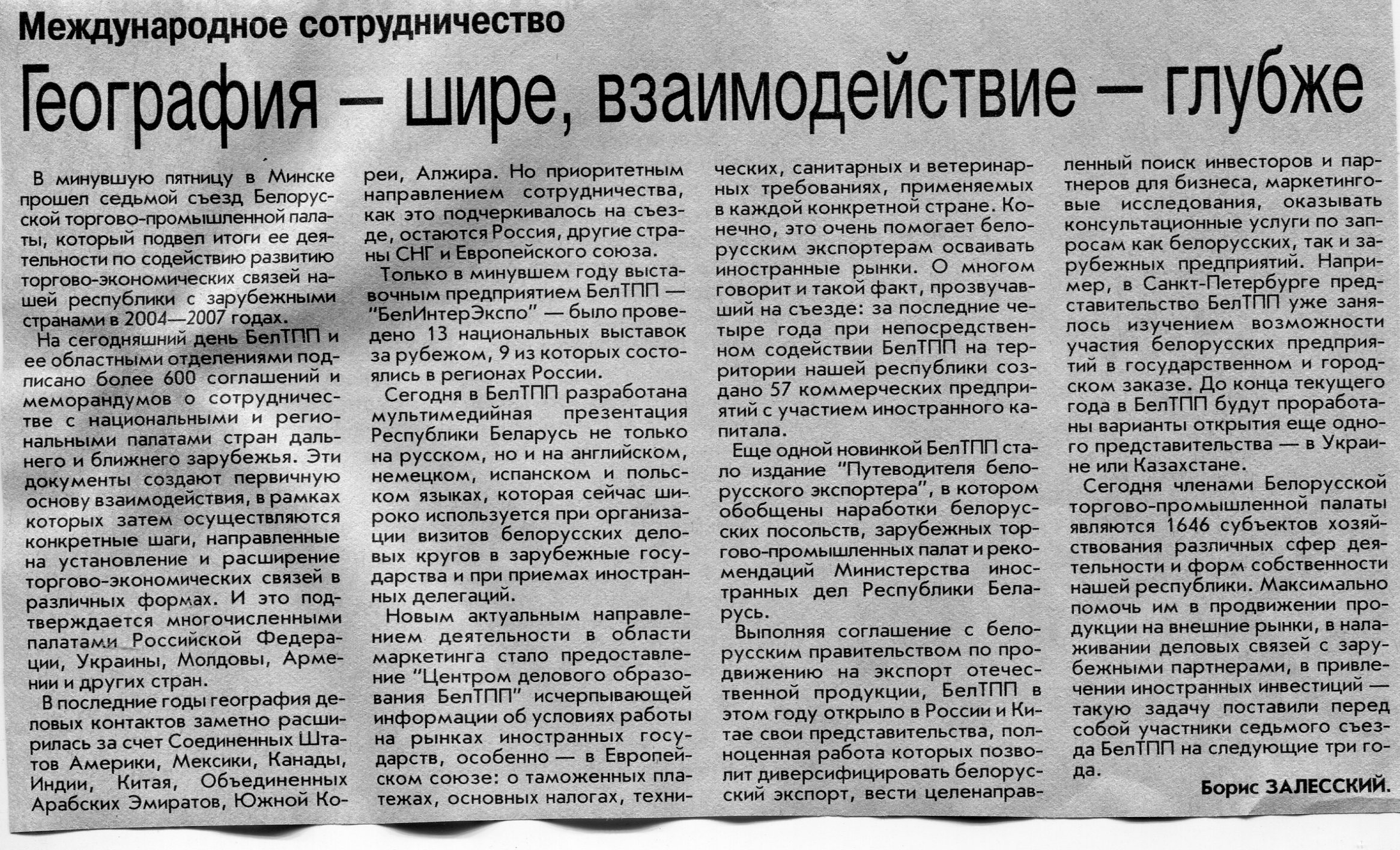 Залесский, Б. География - шире, взаимодействие - глубже / Б. Залесский // Вечерний Минск. – 2007. – 15 окт.