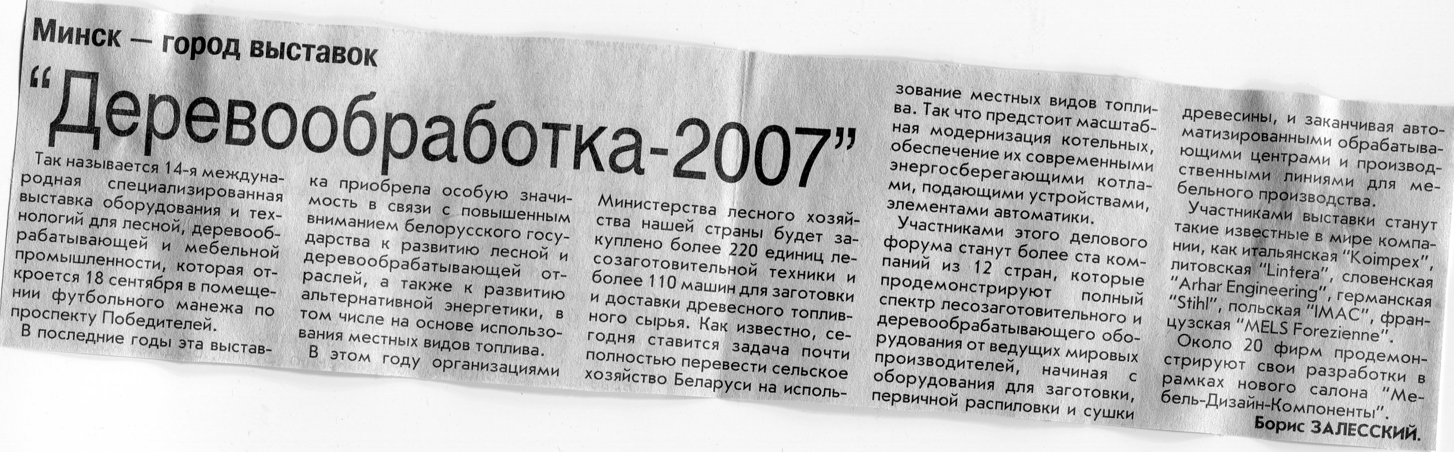 Залесский, Б. "Деревообработка-2007" / Б. Залесский // Вечерний Минск. – 2007. – 17 сент.