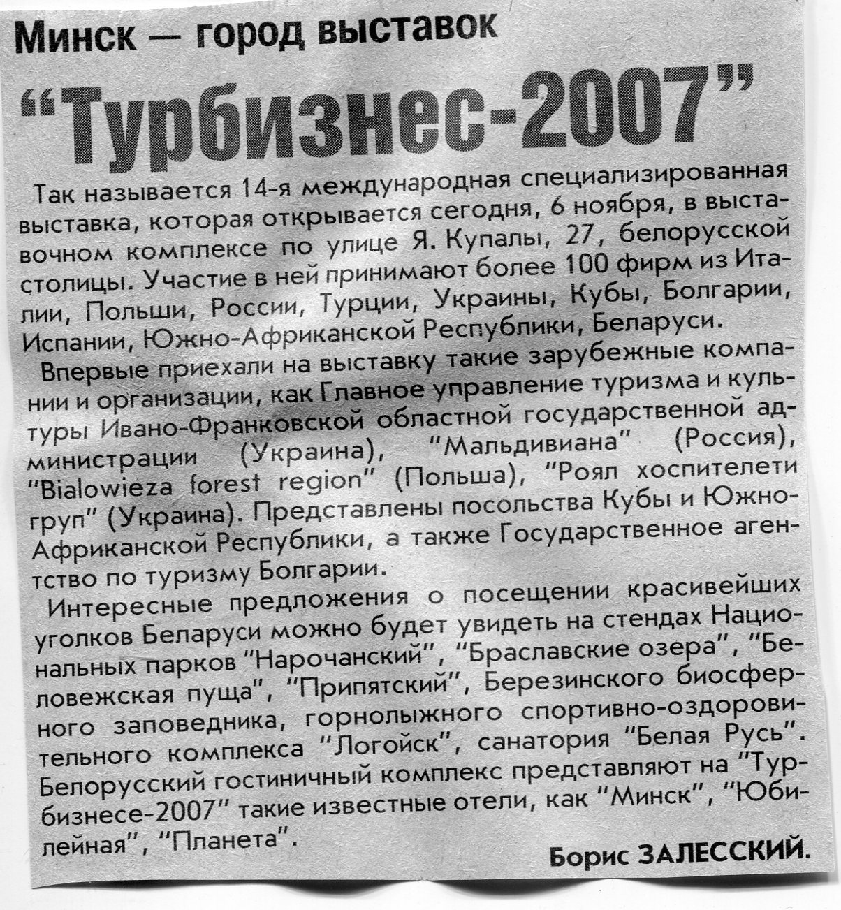 Залесский, Б. "Турбизнес-2007" / Б. Залесский // Вечерний Минск. – 2007. – 6 нояб.