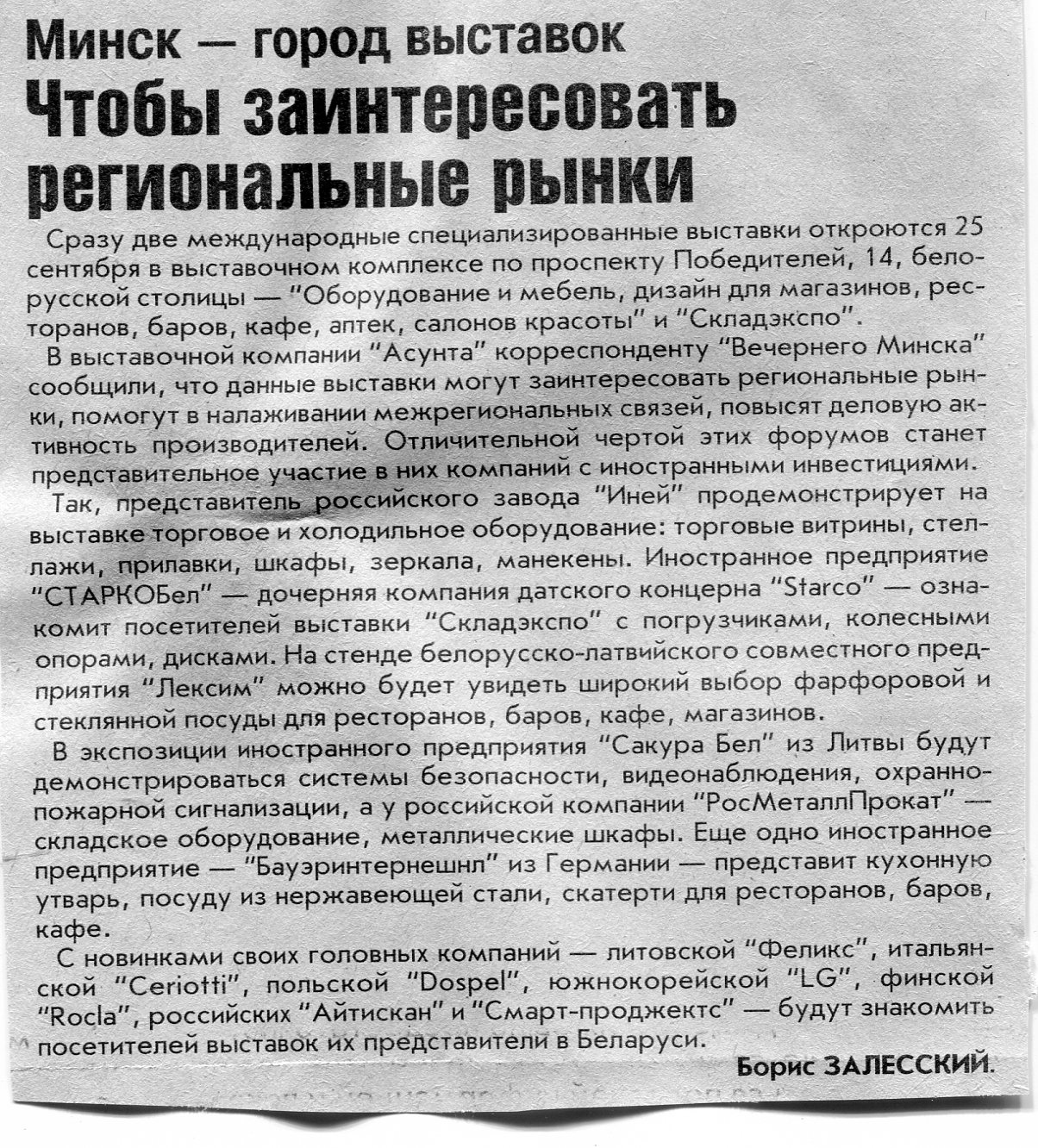 Залесский, Б. Чтобы заинтересовать региональные рынки / Б. Залесский // Вечерний Минск. – 2007. – 25 сент.