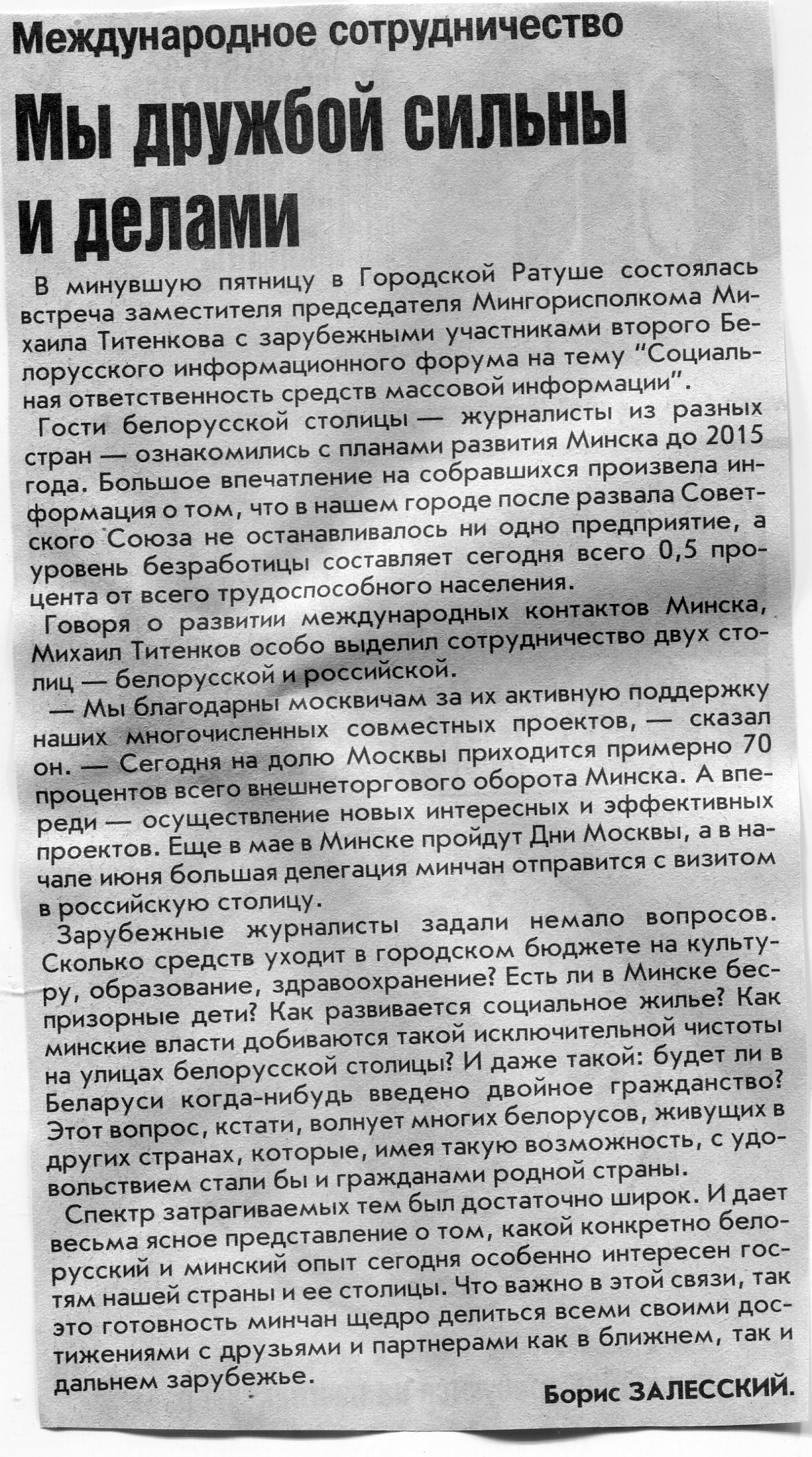 Залесский, Б. Мы дружбой сильны и делами / Б. Залесский // Вечерний Минск. – 2007. – 7 мая.