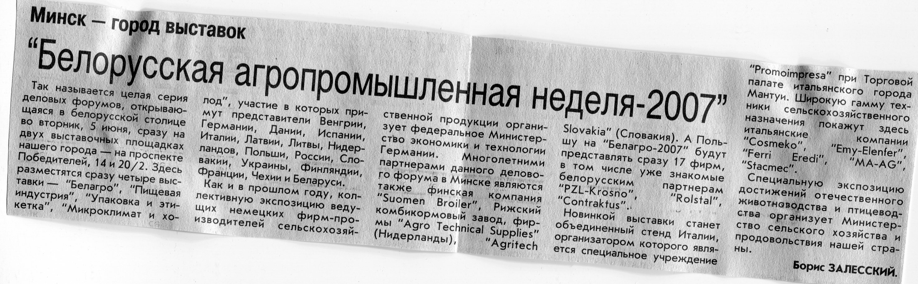 Залесский, Б. "Белорусская агропромышленная неделя-2007" / Б. Залесский // Вечерний Минск. – 2007. – 4 июн.