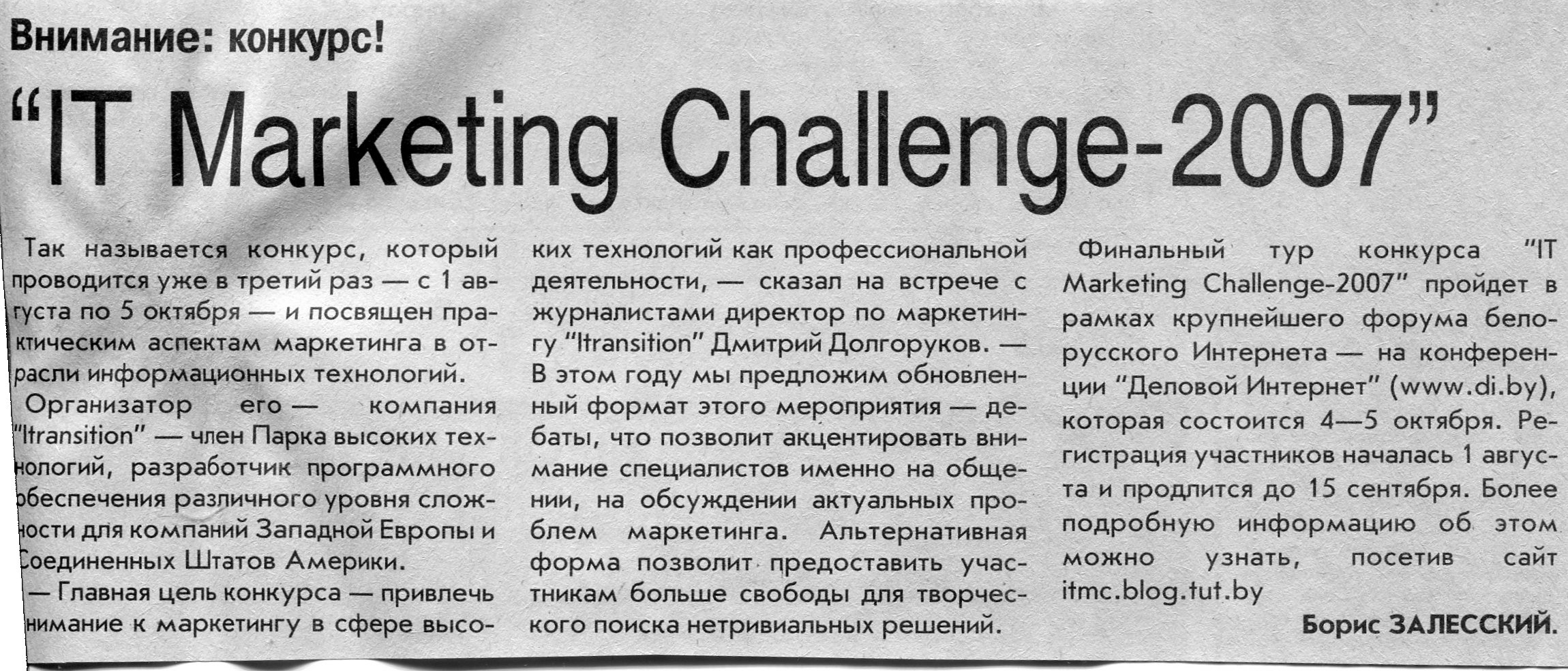 Залесский, Б. "IT Marketing Challenge-2007" / Б. Залесский // Вечерний Минск. – 2007. – 2 авг.
