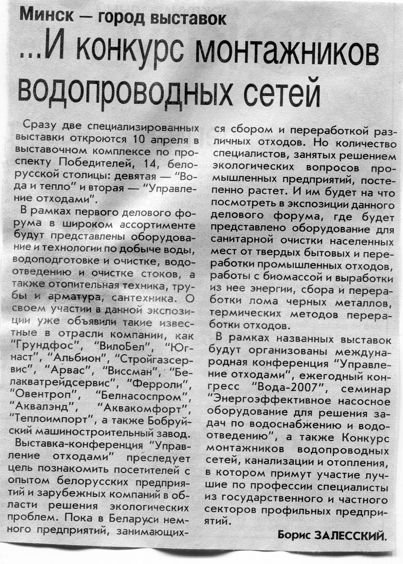 Залесский, Б. ... И конкурс монтажников водопроводных сетей / Б. Залесский // Вечерний Минск. – 2007. – 5 апр.