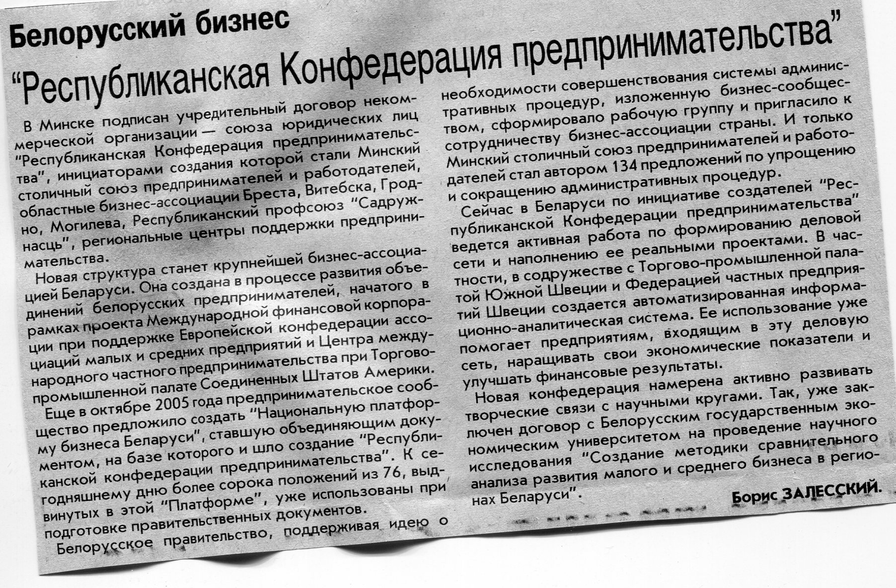 Залесский, Б. "Республиканская Конфедерация предпринимательства" / Б. Залесский // Вечерний Минск. – 2007. – 7 авг.
