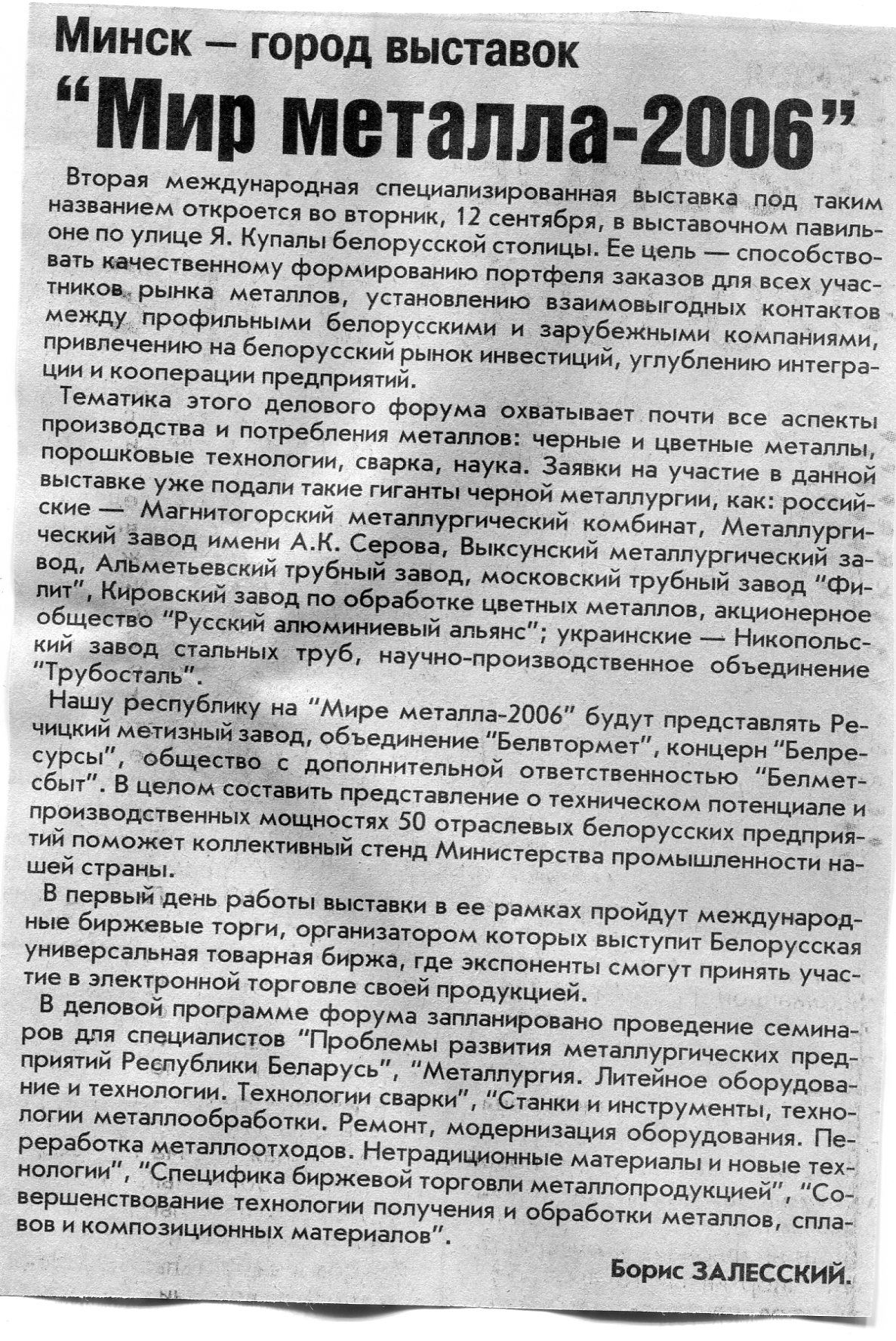 Залесский, Б. "Мир металла-2006" / Б. Залесский // Вечерний Минск. – 2006. – 1 сент.