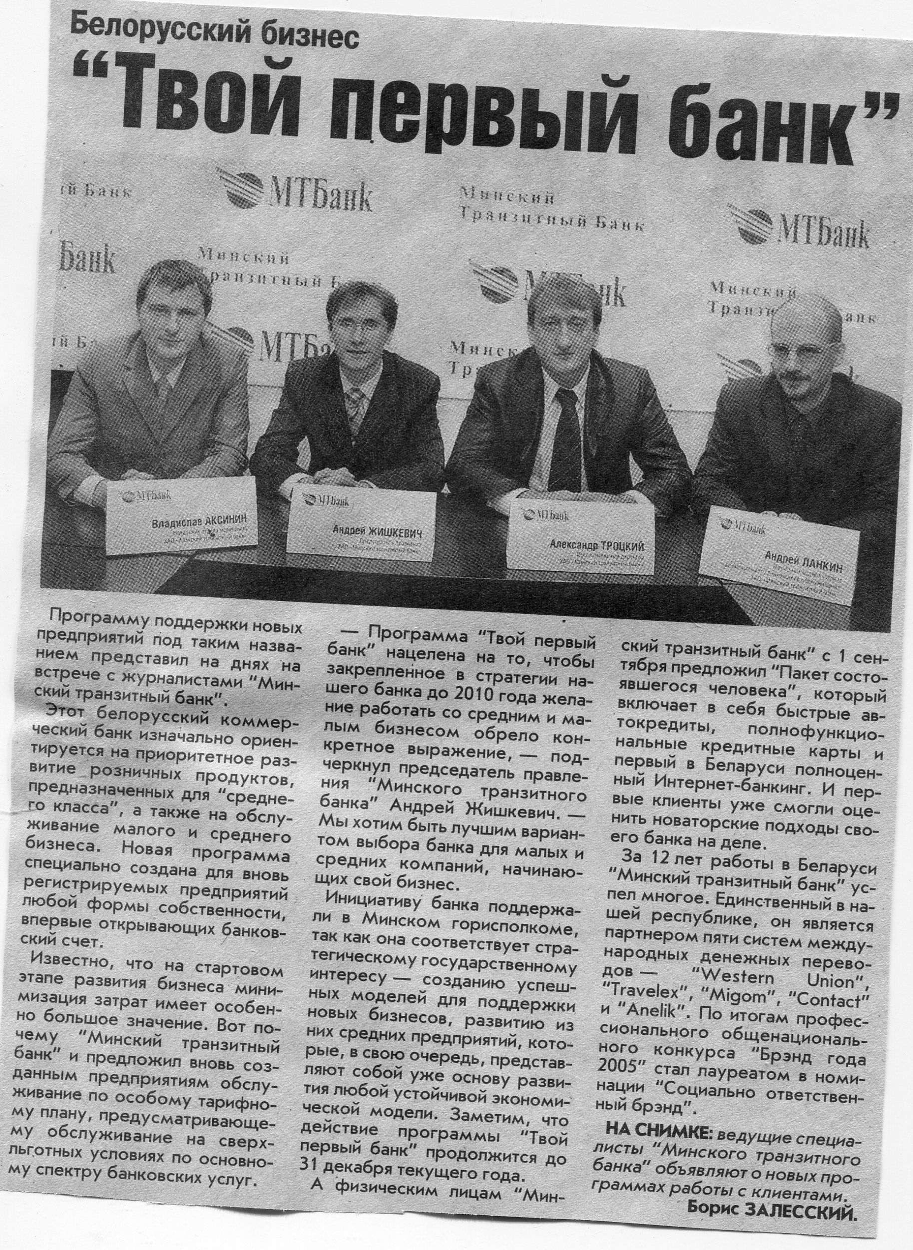 Залесский, Б. "Твой первый банк" / Б. Залесский // Вечерний Минск. – 2006. – 14 сент.