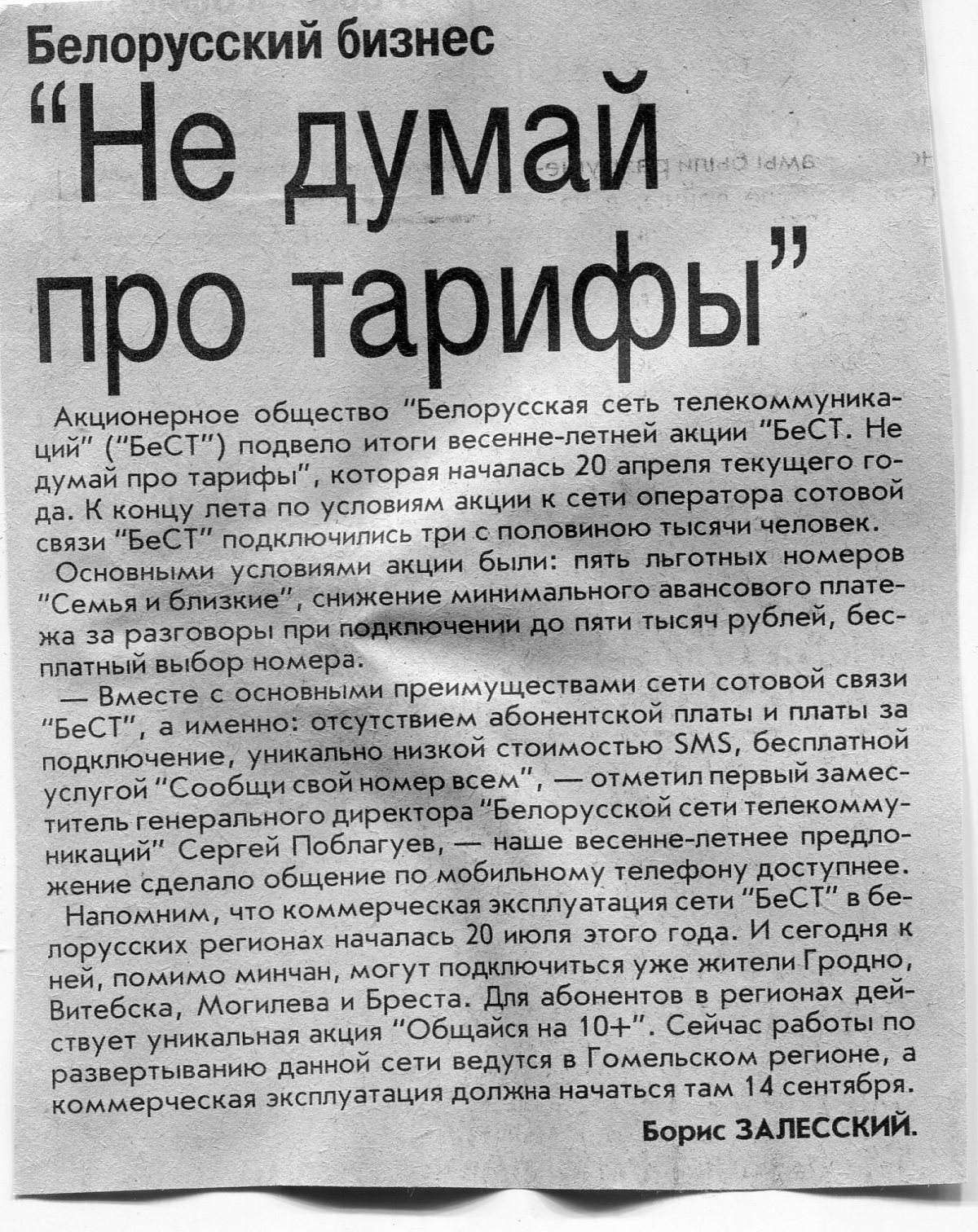 Залесский, Б. "Не думай про тарифы" / Б. Залесский // Вечерний Минск. – 2006. – 25 сент.