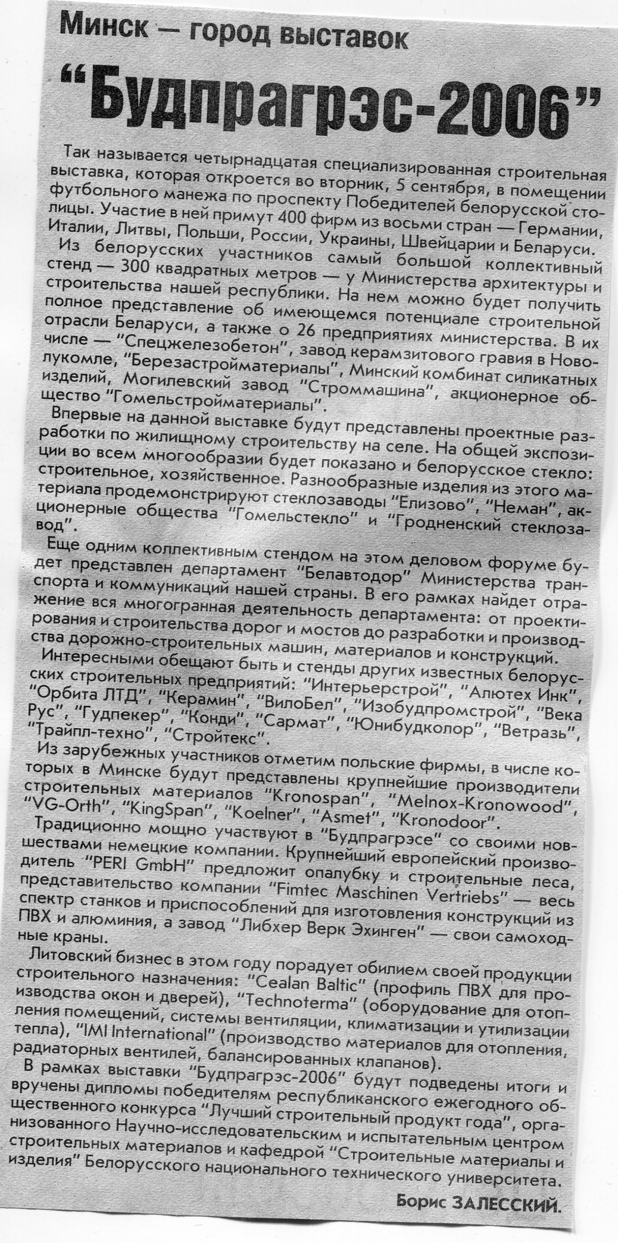Залесский, Б. "Будпрагрэс-2006" / Б. Залесский // Вечерний Минск. – 2006. – 28 авг.