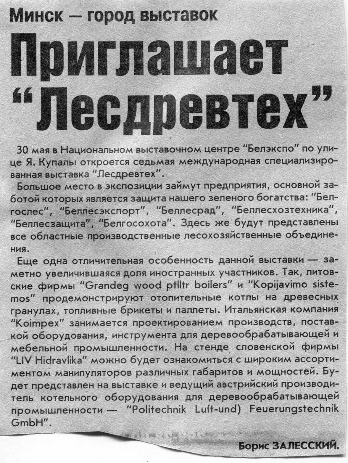 Залесский, Б. Приглашает "Лесдревтех" / Б. Залесский // Вечерний Минск. – 2006. – 25 мая.