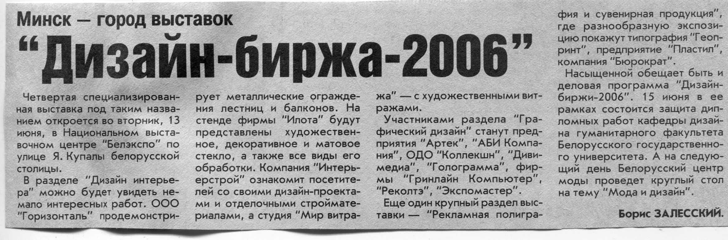 Залесский, Б. "Дизайн-биржа-2006" / Б. Залесский // Вечерний Минск. – 2006. – 12 июн.