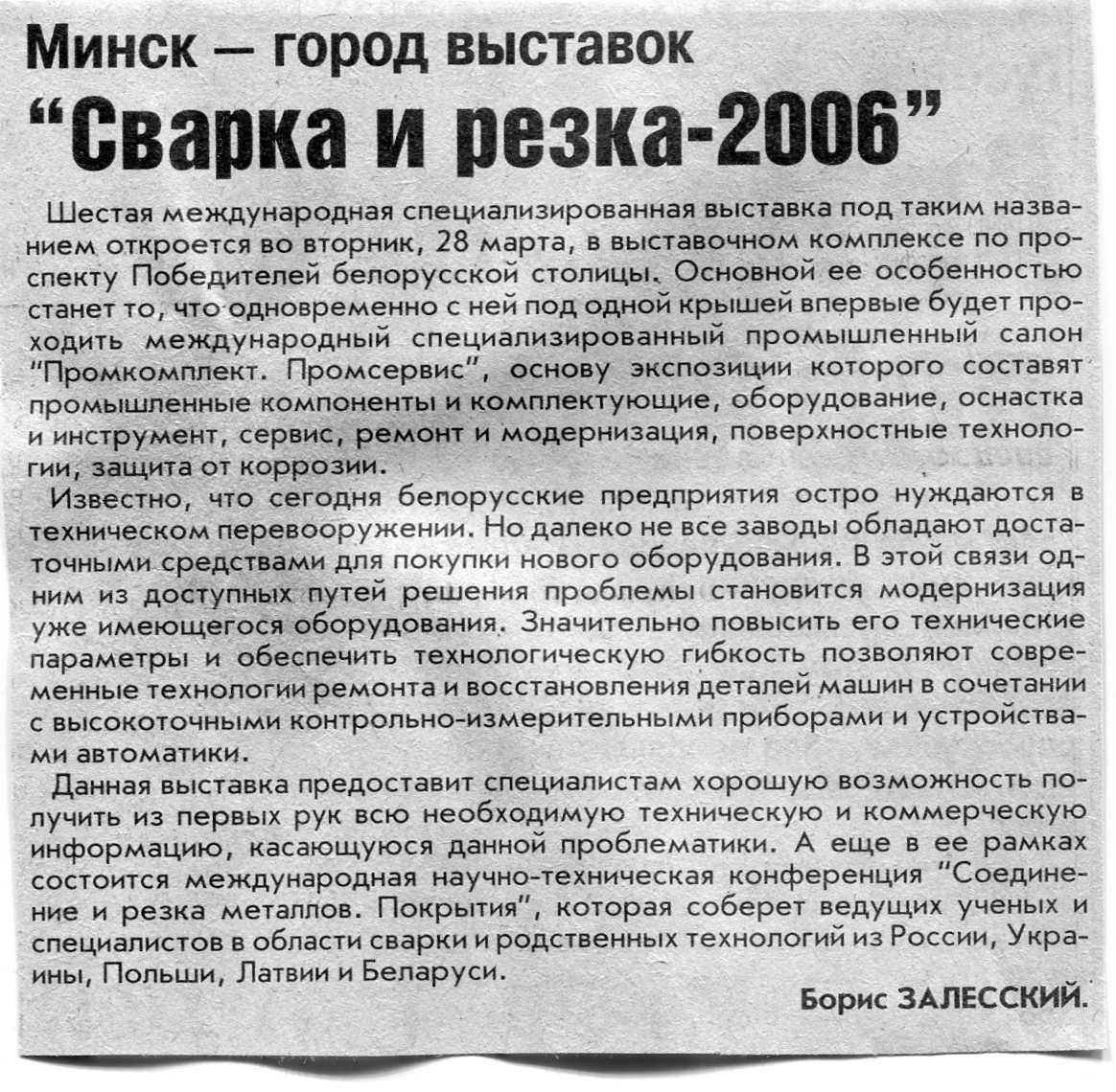 Залесский, Б. "Сварка и резка-2006" / Б. Залесский // Вечерний Минск. – 2006. – 27 мар.