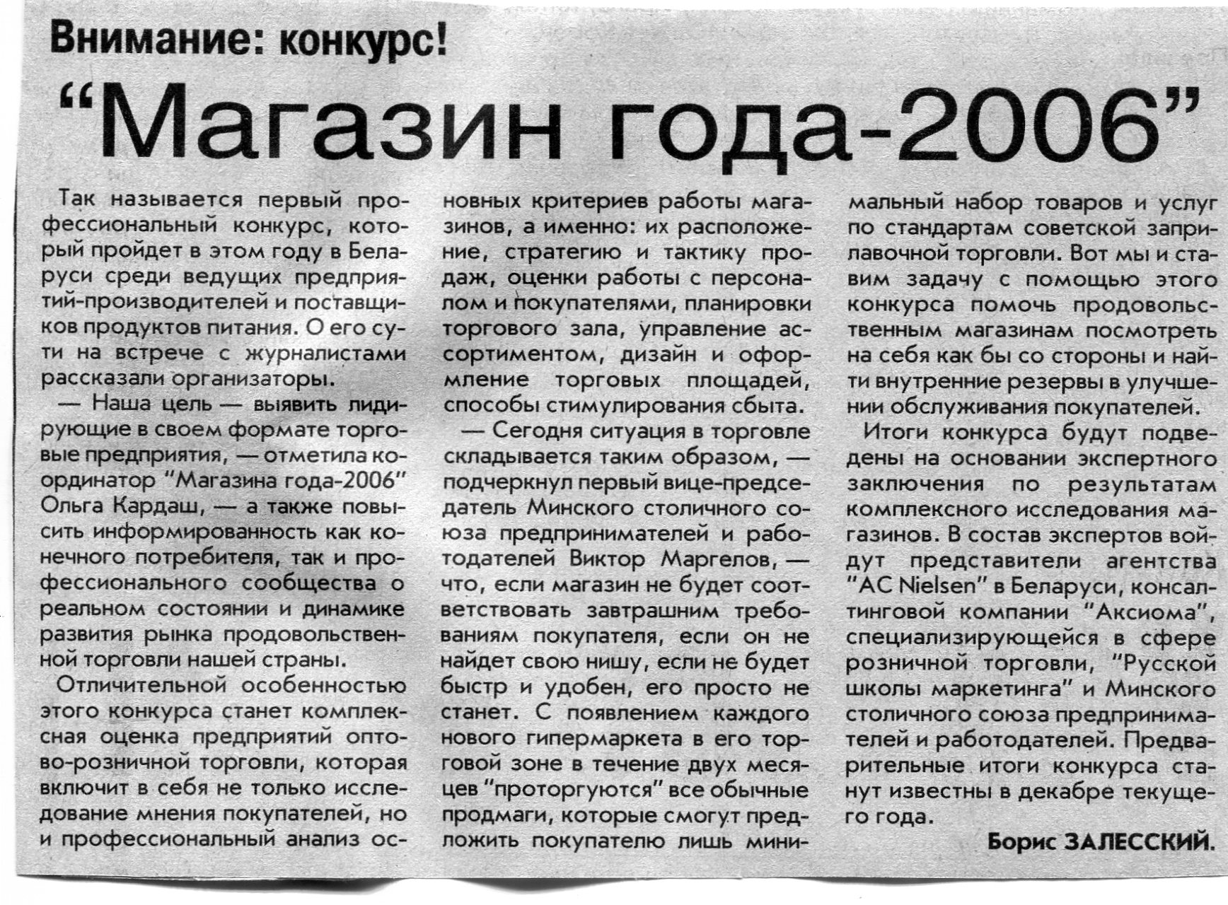 Залесский, Б. "Магазин года-2006" / Б. Залесский // Вечерний Минск. – 2006. – 15 мая.