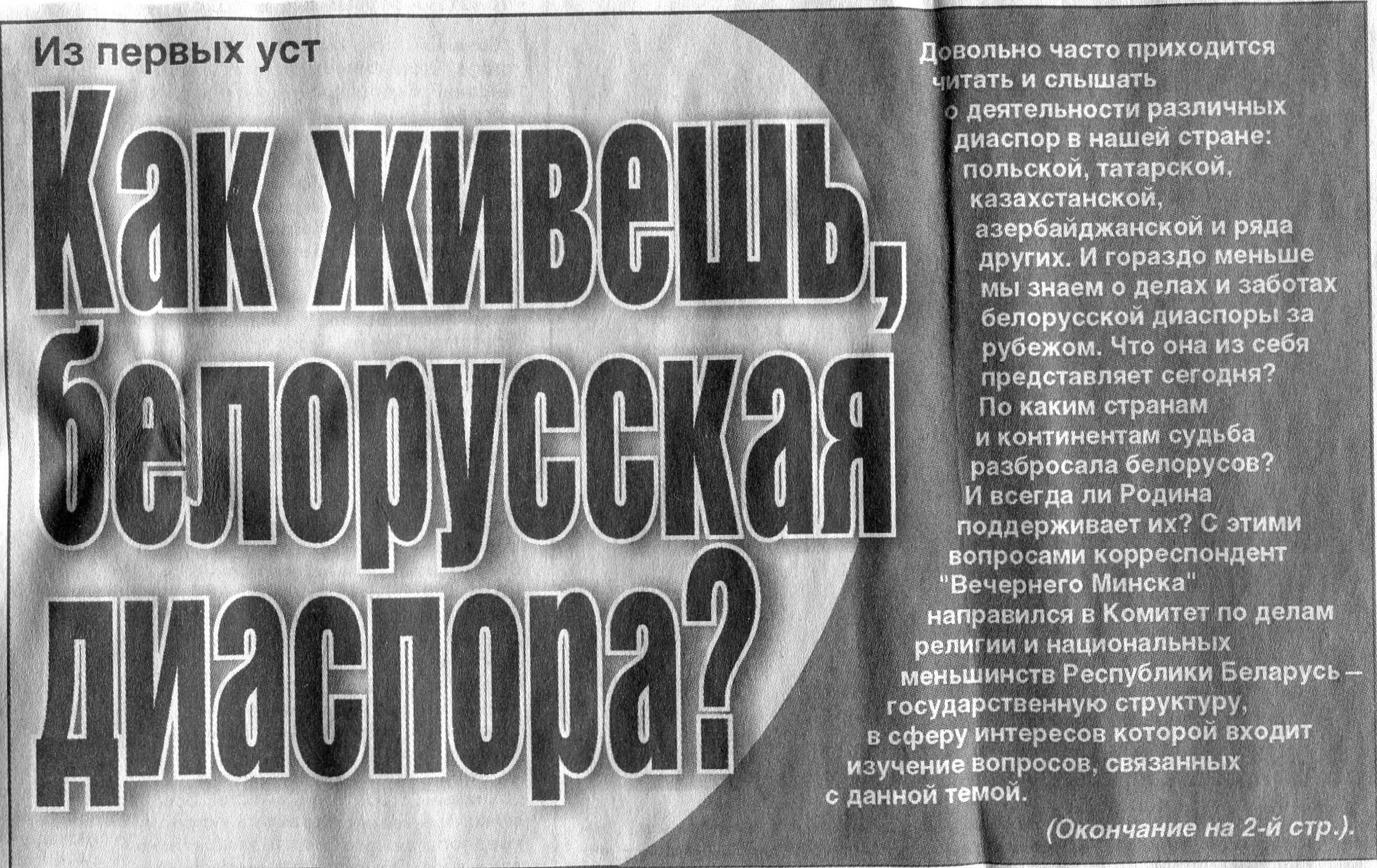 Залесский, Б. Как живешь, белорусская диаспора? (1) / Б. Залесский // Вечерний Минск. – 2006. - 15 февр.